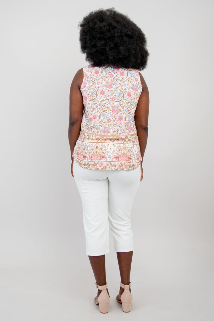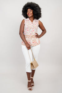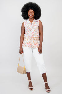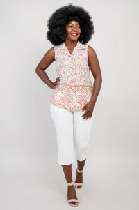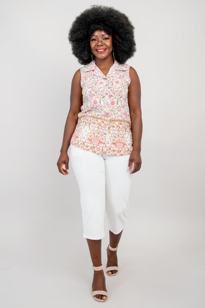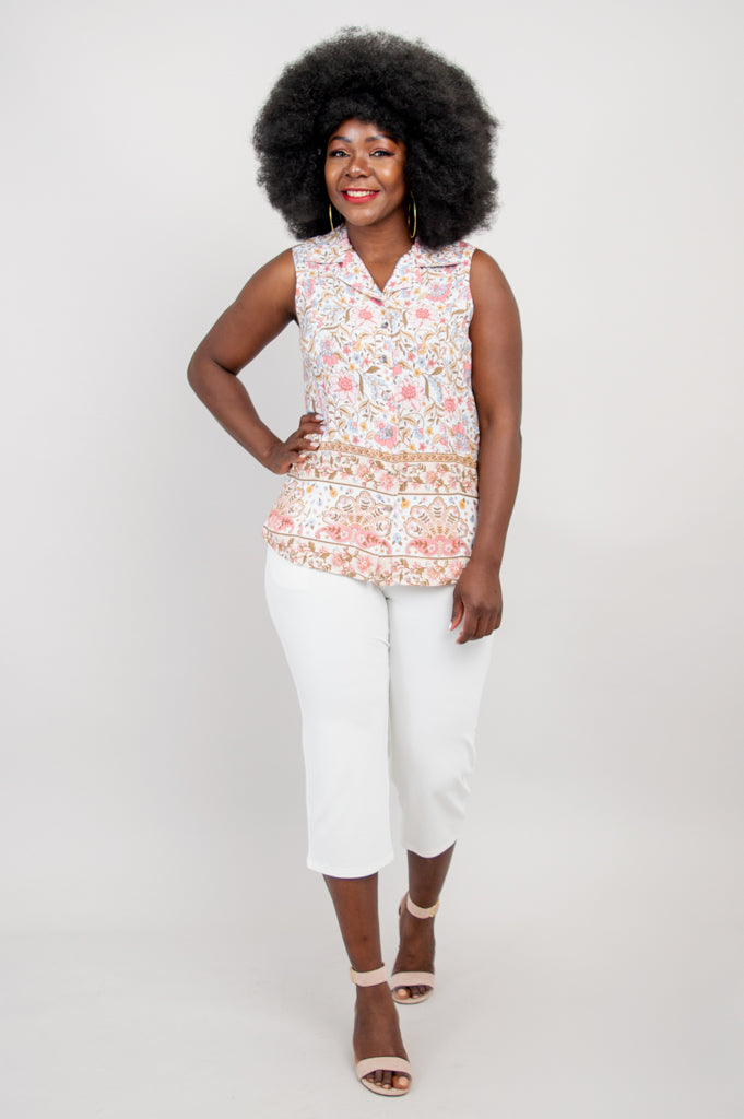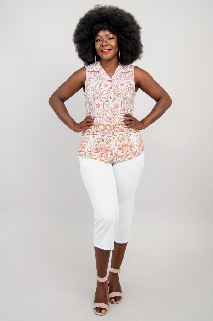 Our Aida Top features a collar neckline, princess seaming and button-up closure. Slit vents on either side of the hip give extra room for fit and comfort. The no-sleeve design of the Aida allows it to be worn under a cardigan or on its own.