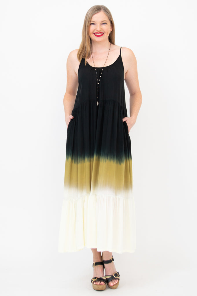 This lightweight, tiered maxi dress will be your go to for warm days and tropical vacations. The soft and light fabric is perfect for keeping you cool on those humid days. Adjustable straps, scoop neckline and pockets complete the look.