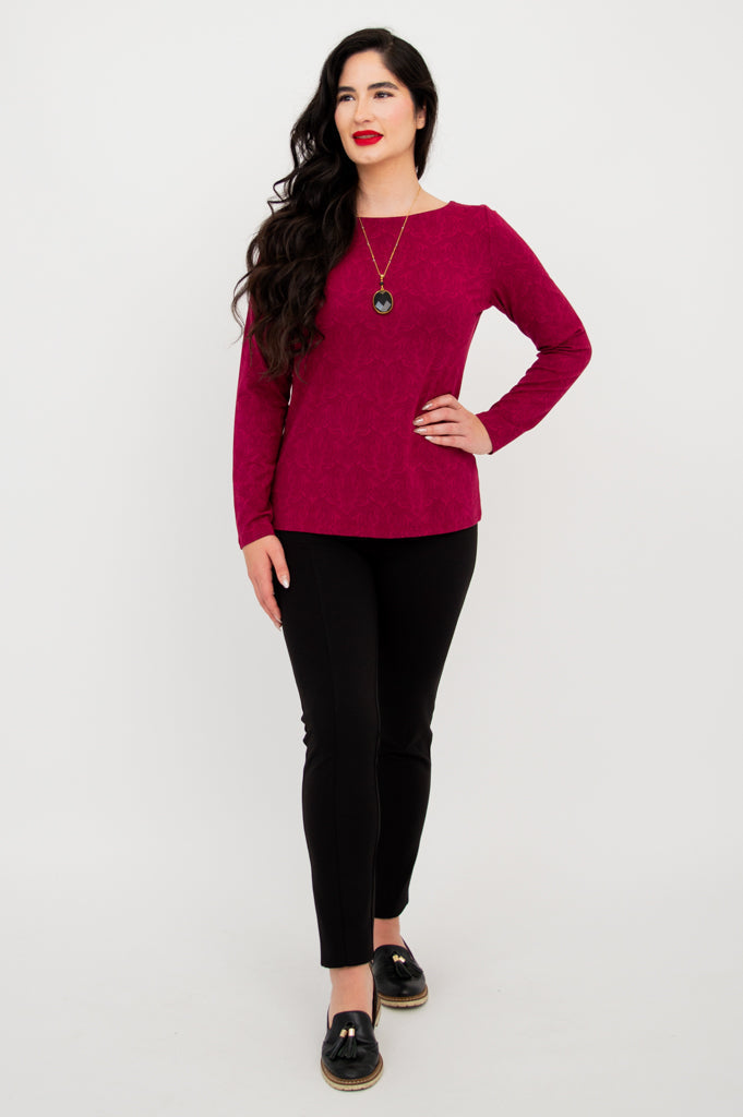 The Celia Long Sleeve Top is designed to flatter without feeling restrictive. Its fitted yet comfortable design makes it ideal for layering under jackets or cardigans, while the hemmed waistline adds a polished finishing touch.