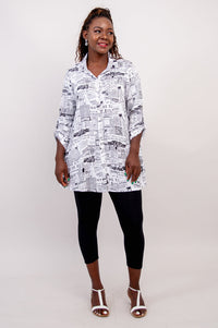 The soft shape of Bamboo/Linen in an oversized tunic with pockets. Shirt style at the shoulder, with a collar and button placket down the front. The Celine falls into a flowy and full, A-line shape. Pair it with capri pants or leggings.