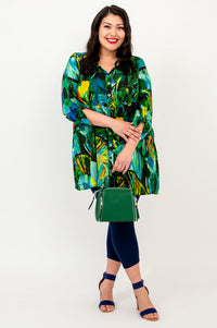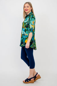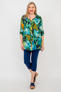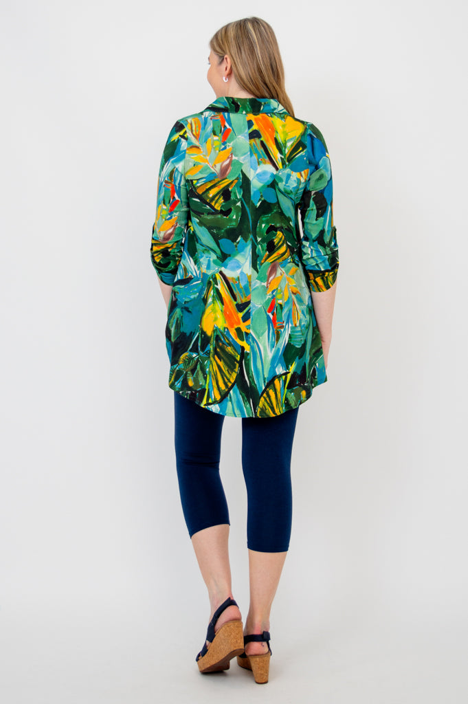 The soft shape of Bamboo/Linen in an oversized tunic with pockets. Shirt style at the shoulder, with a collar and button placket down the front. The Celine falls into a flowy and full, A-line shape. Pair it with capri pants or leggings.