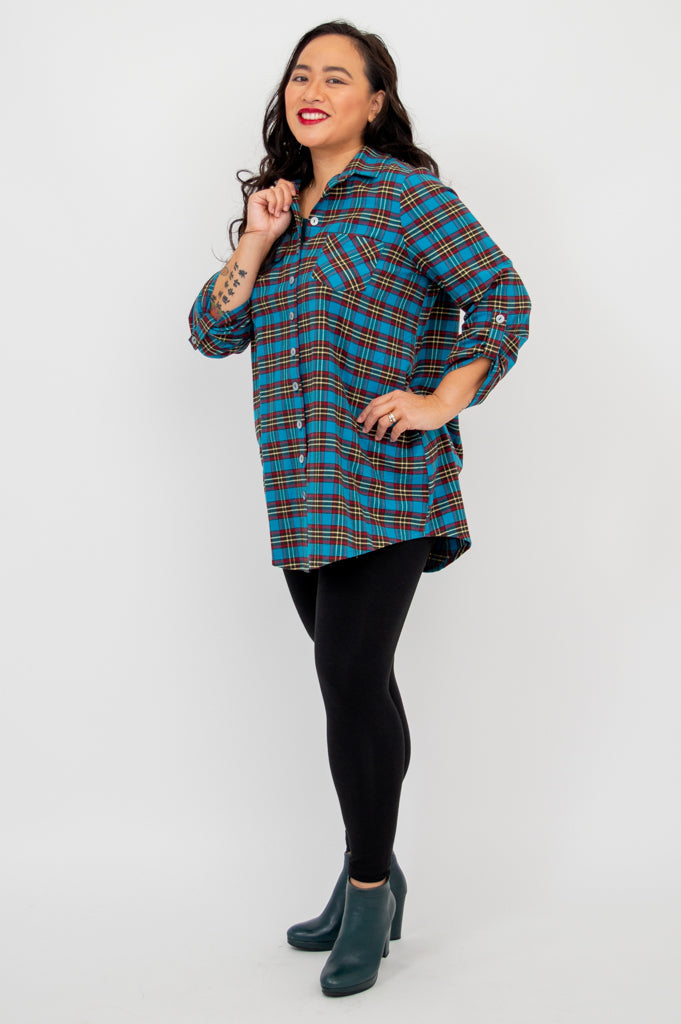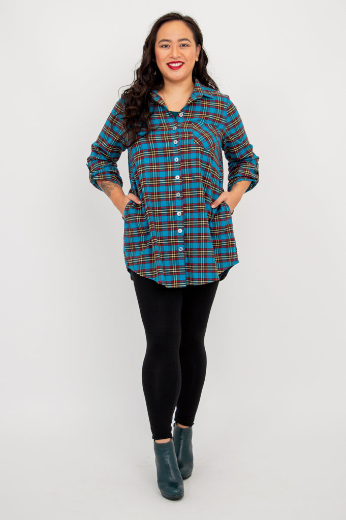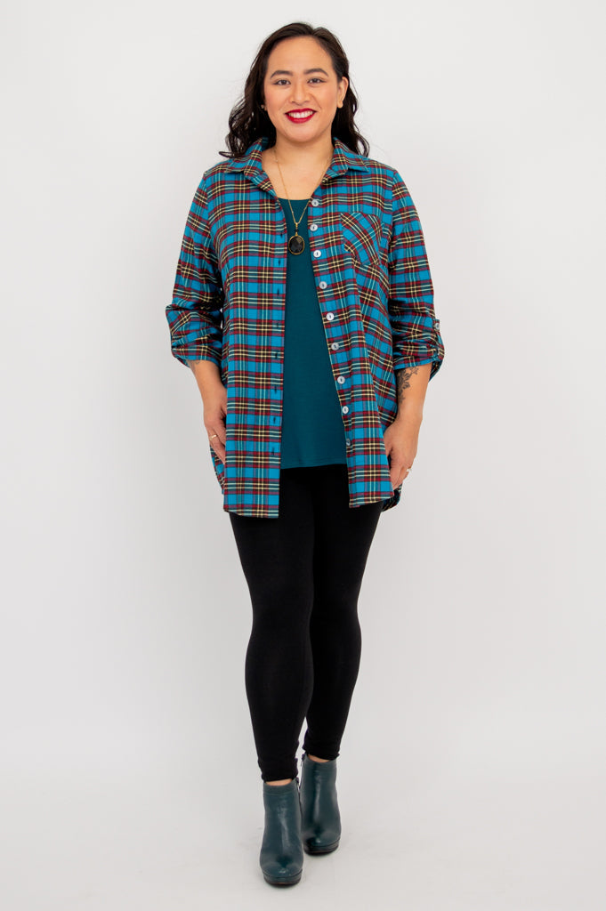 The soft shape of Cotton Flannel in an oversized tunic with pockets. Shirt style at the shoulder, with a collar and button placket down the front. The Celine falls into a flowy and full, A-line shape. Pair it with capri pants or leggings.