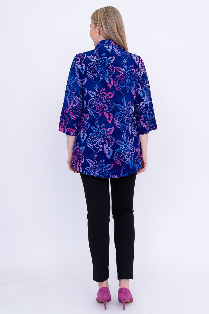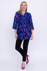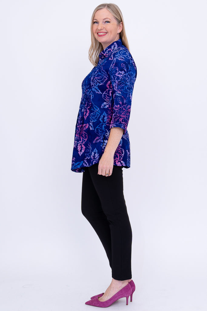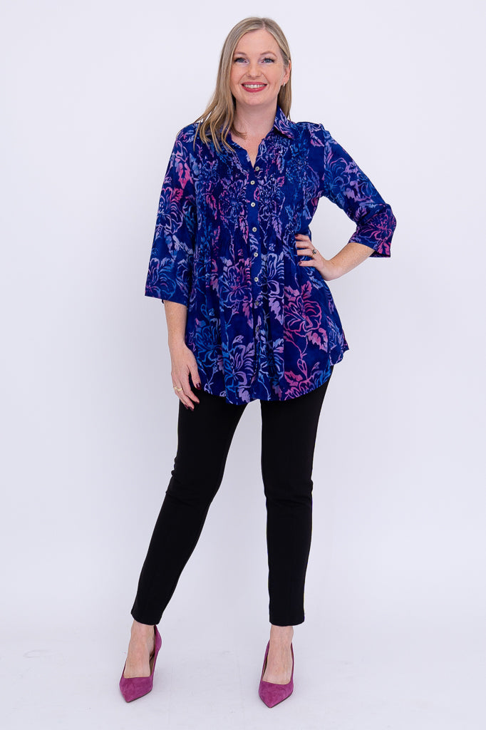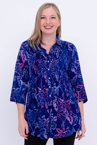 The Cindy features 3/4 sleeves with a smocked bodice and soft pleating in the front. A button front placket and simple shirt styling in the back. The Cindy is a customer favourite!