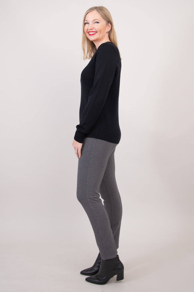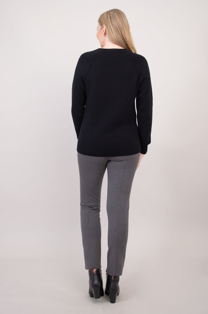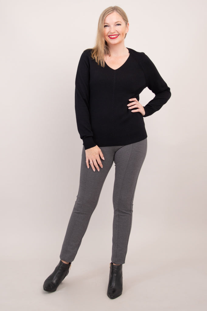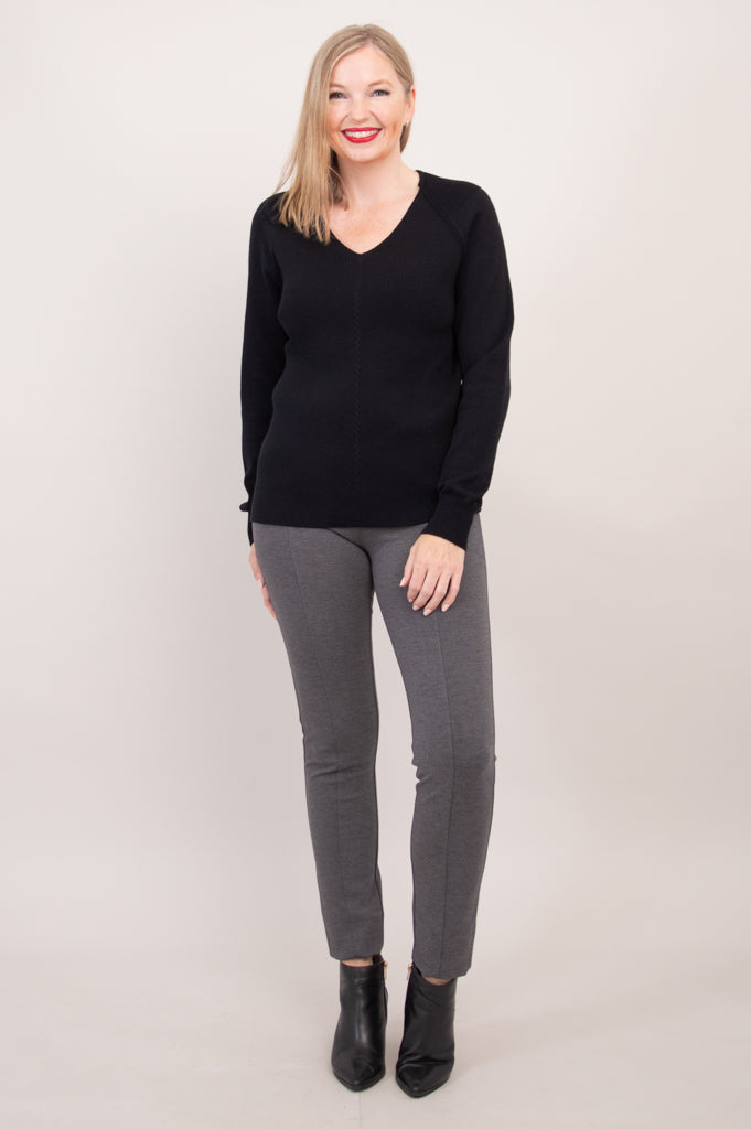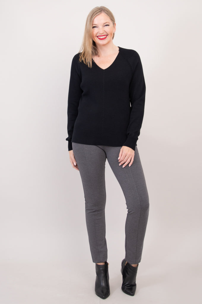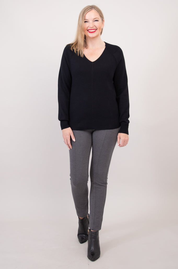 The Claudia Sweater is the definition of understated elegance! With seam details and texture on the shoulders and raglan sleeves, these small details elevate the simple design. The V-neckline and center front seam help create an elongated look. Pair this sweater with the Nadine Crop in Granite for a chic everyday look!