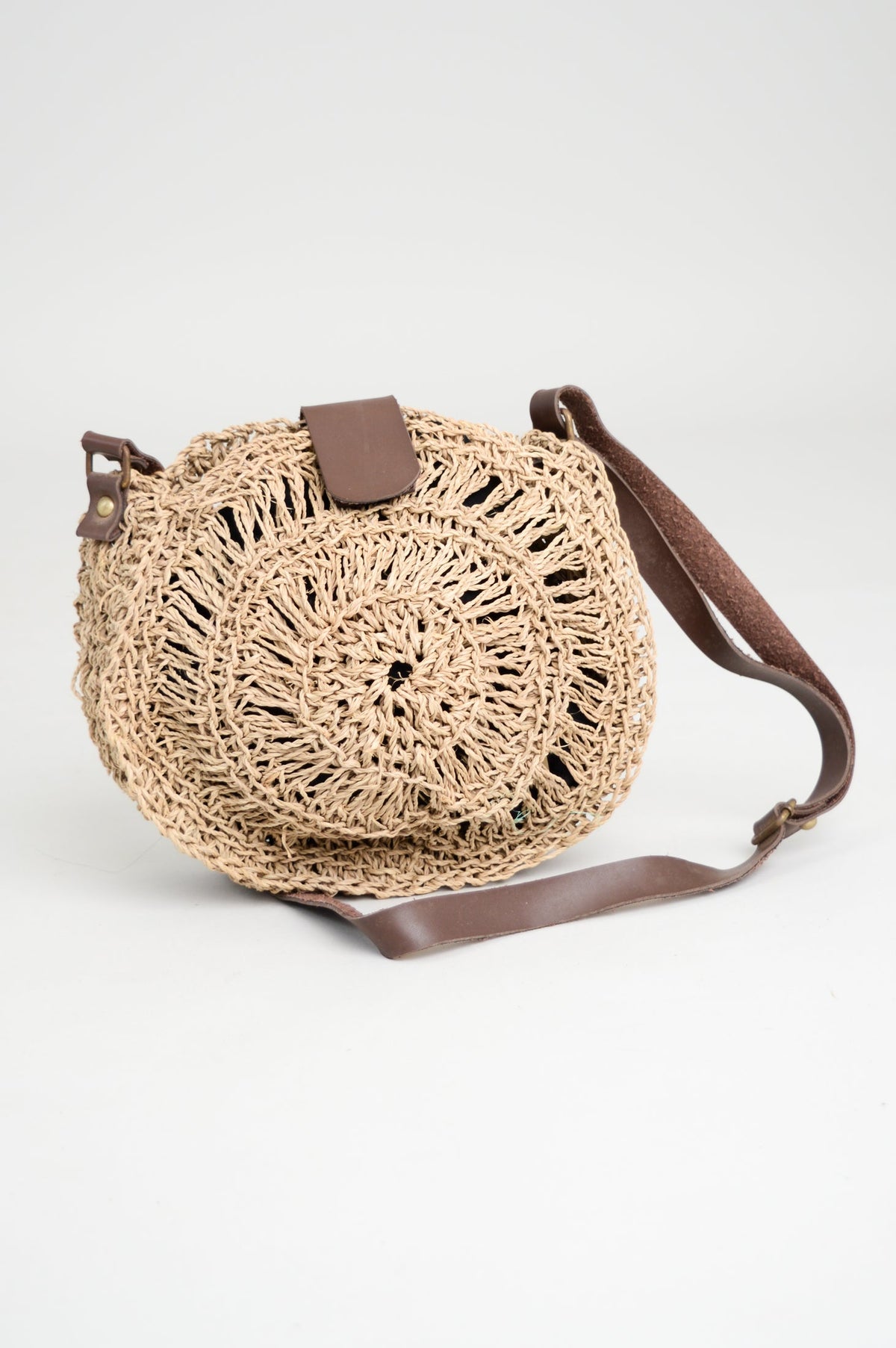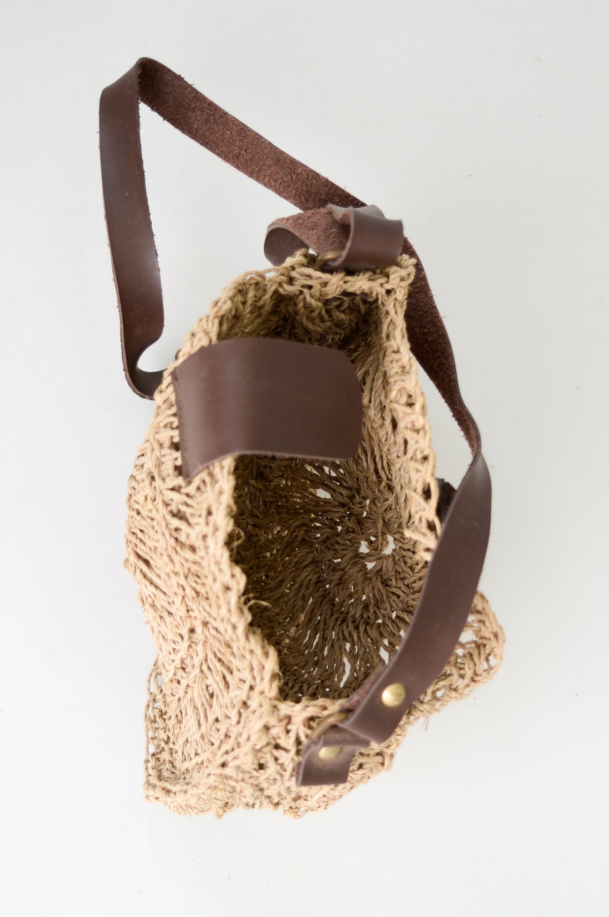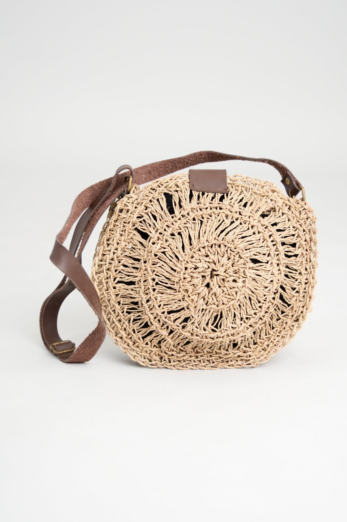 Hand woven rattan bag with brown leather handle.