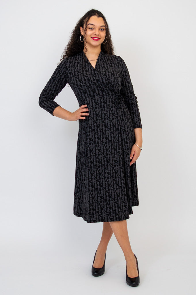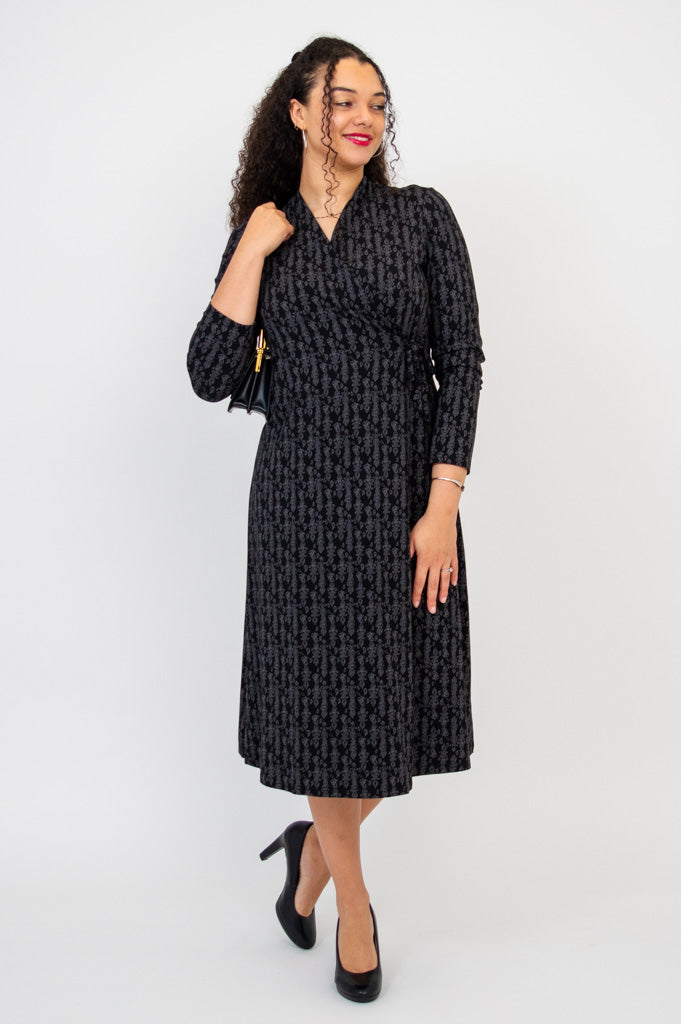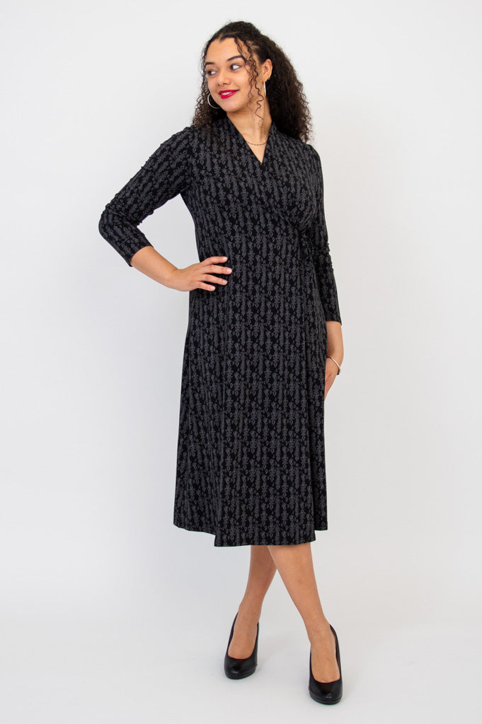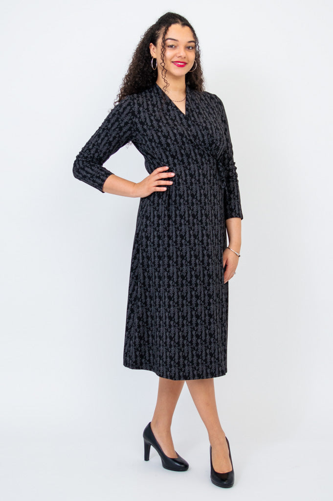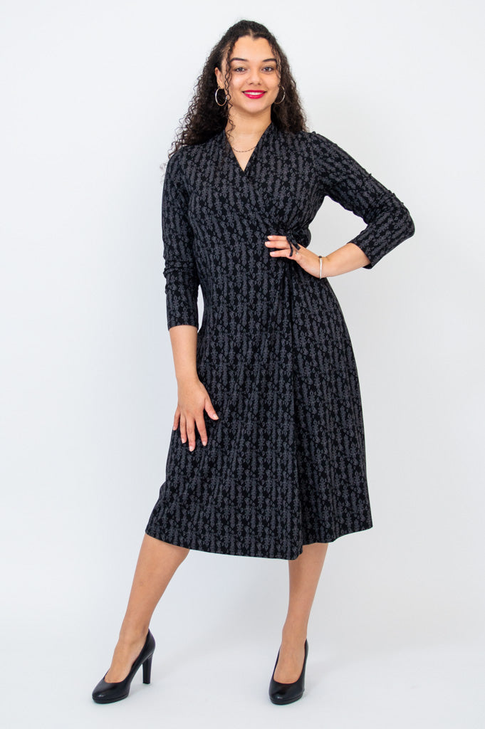 The Desire Dress can shift from an elegant night-out dress to a lounging-around-the-house comfort piece. A surplice neckline is created but the wrap-style design. A tie closure at the waist is secure and creates waist definition, while also allowing the wearer to control the fit. This dress is great for those who want more coverage, and an adjustable fit.