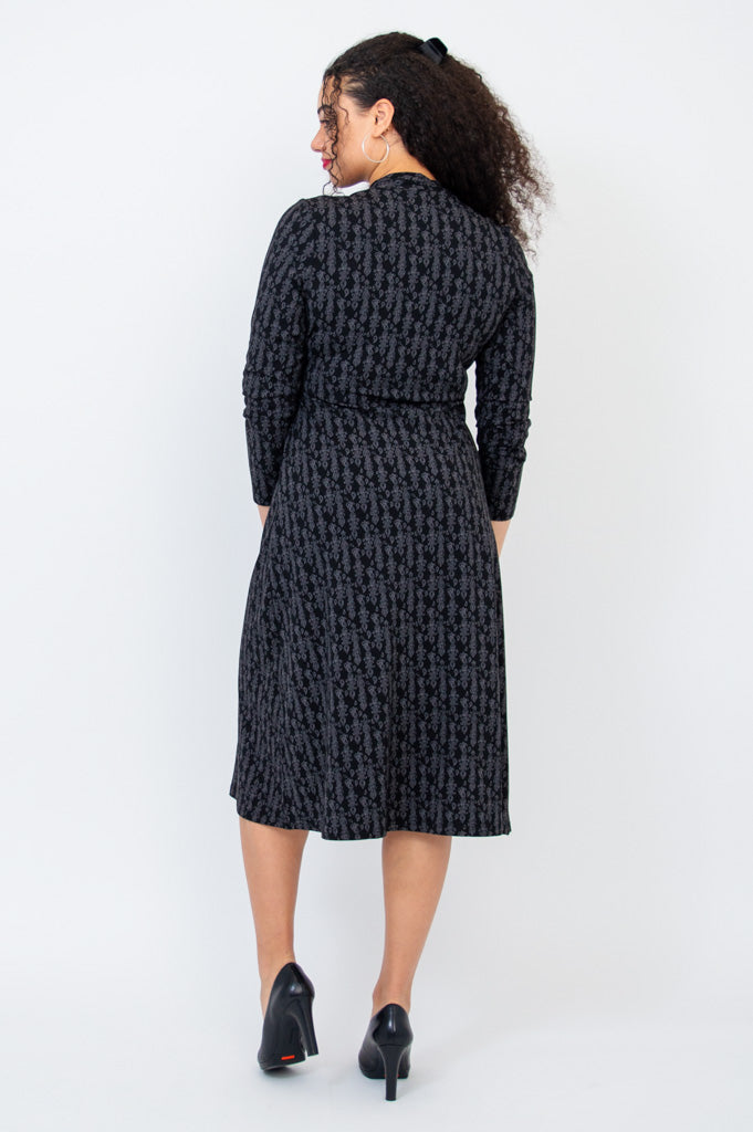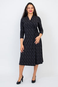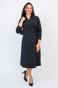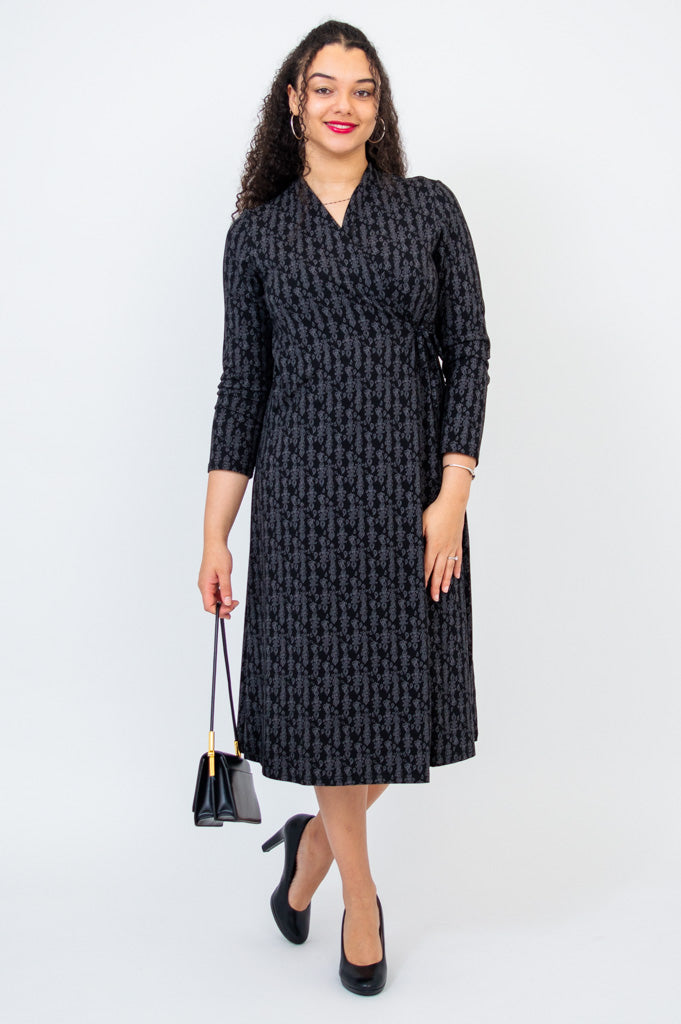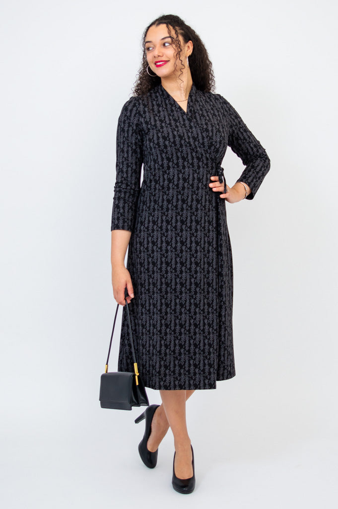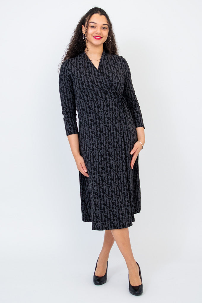 The Desire Dress can shift from an elegant night-out dress to a lounging-around-the-house comfort piece. A surplice neckline is created but the wrap-style design. A tie closure at the waist is secure and creates waist definition, while also allowing the wearer to control the fit. This dress is great for those who want more coverage, and an adjustable fit.