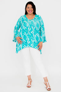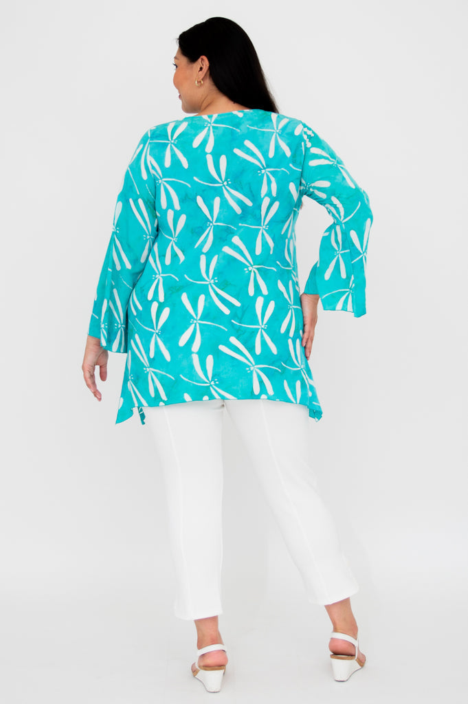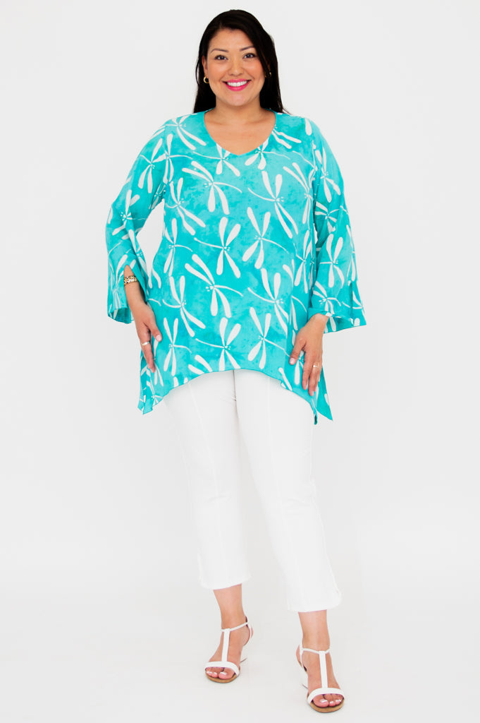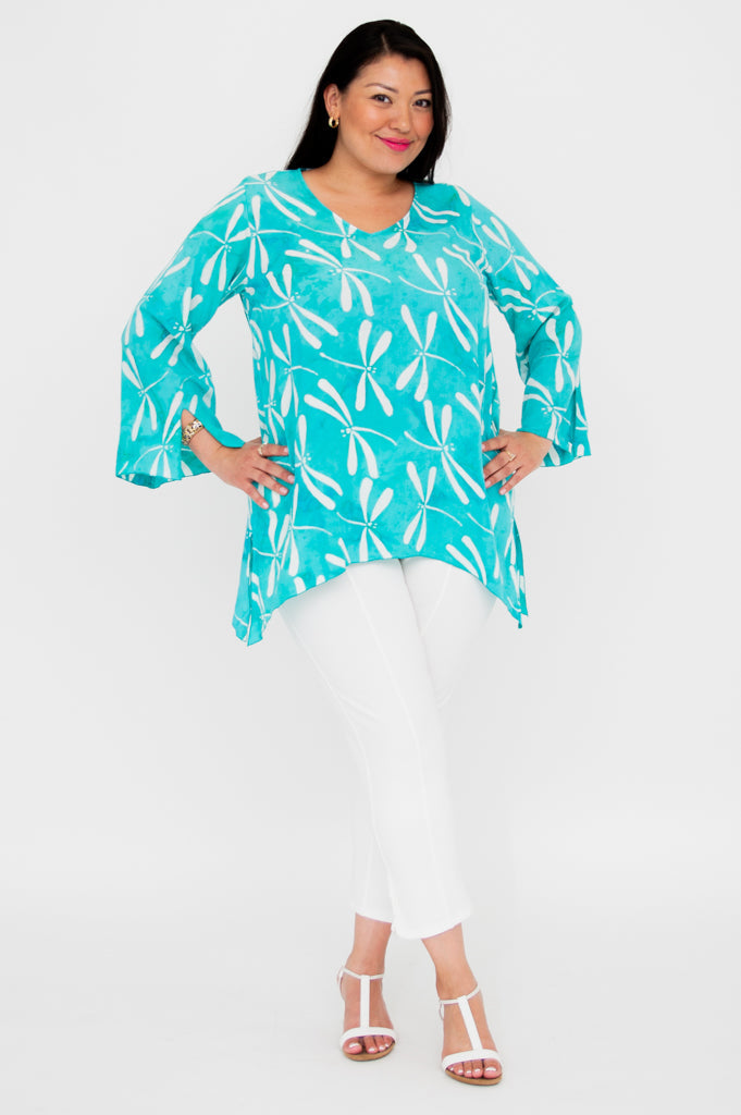 The Dorothy is the ultimate flowy bohemian top. V-neckline, belled sleeves and a shark-bite hemline complete the look. Pair it with leggings or a flowy pant for a cool vibe.