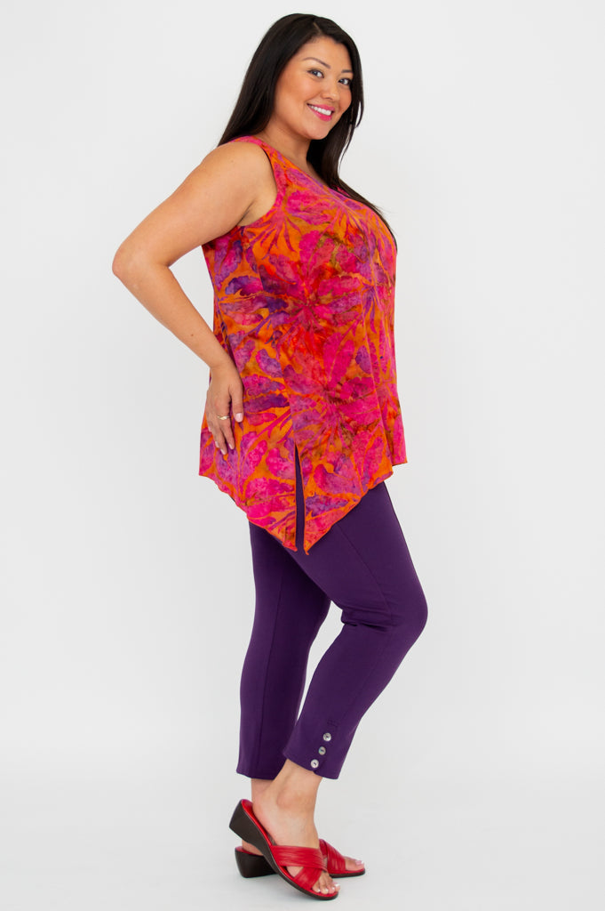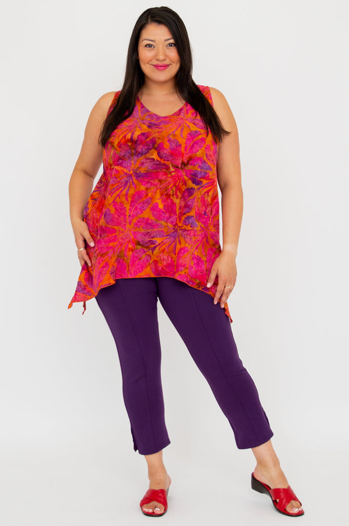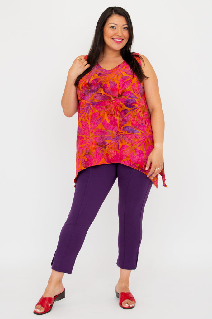 Essentially an easy tank top, extra features makes for great impact: A V neckline establishes a strong vertical axis, while sharkbite shaping blurs the horizontal line. Wide shoulder straps, well-shaped armholes, and darts at the bust hide bra straps and provide coverage, but allow for cool and great fit.