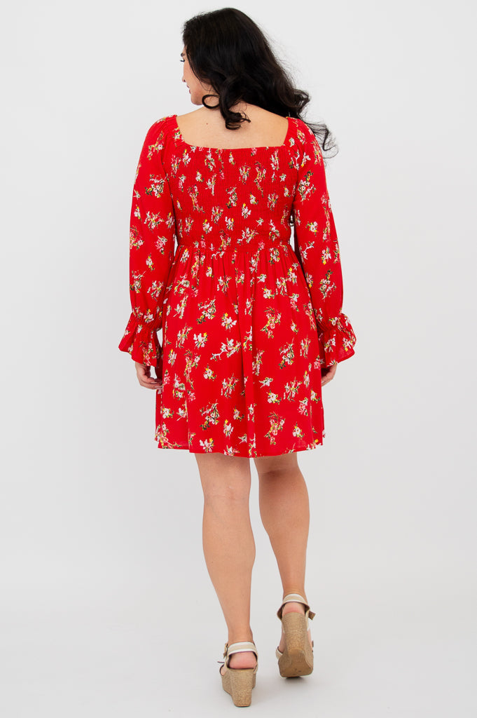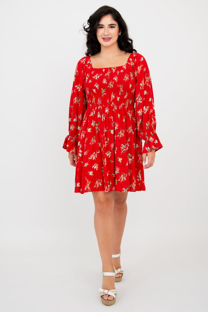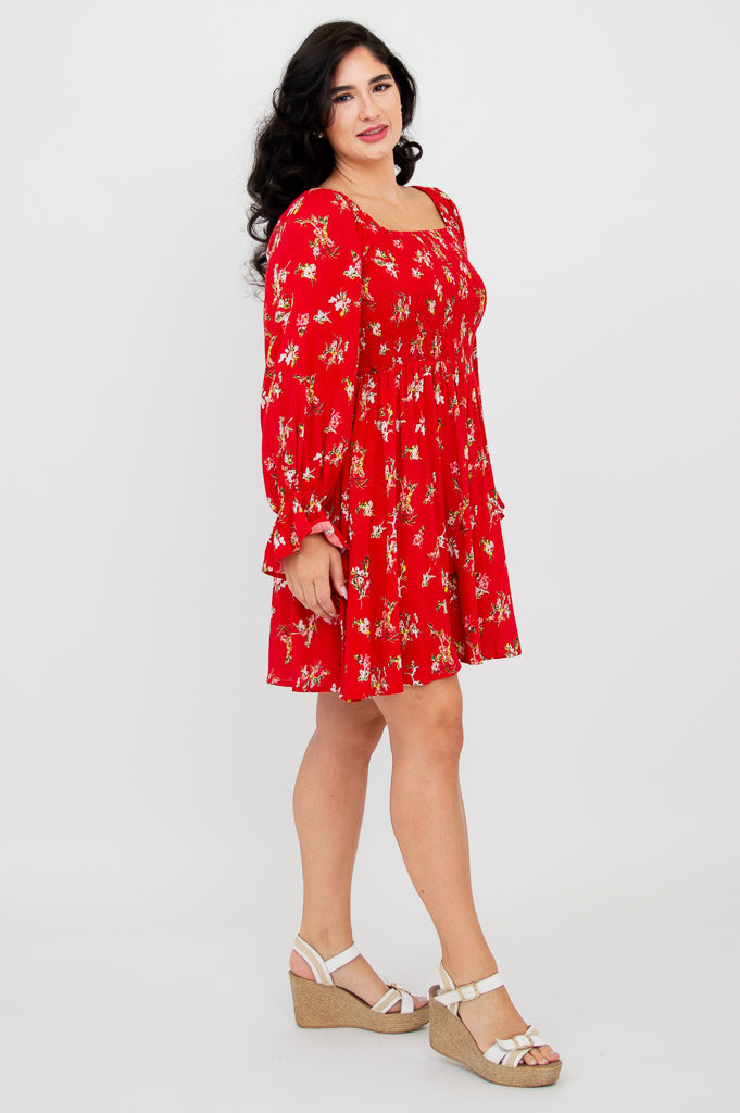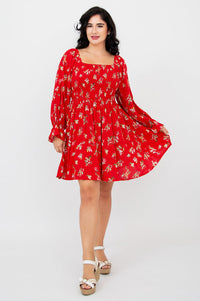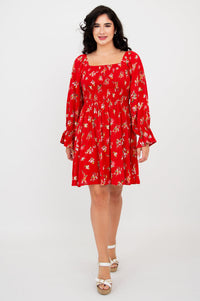 Eden has a delicate feel especially in this red Ditsy Print. The shirred bodice, full skirt to the knee and long ruffles sleeve all add to the feminine feel of this dress.