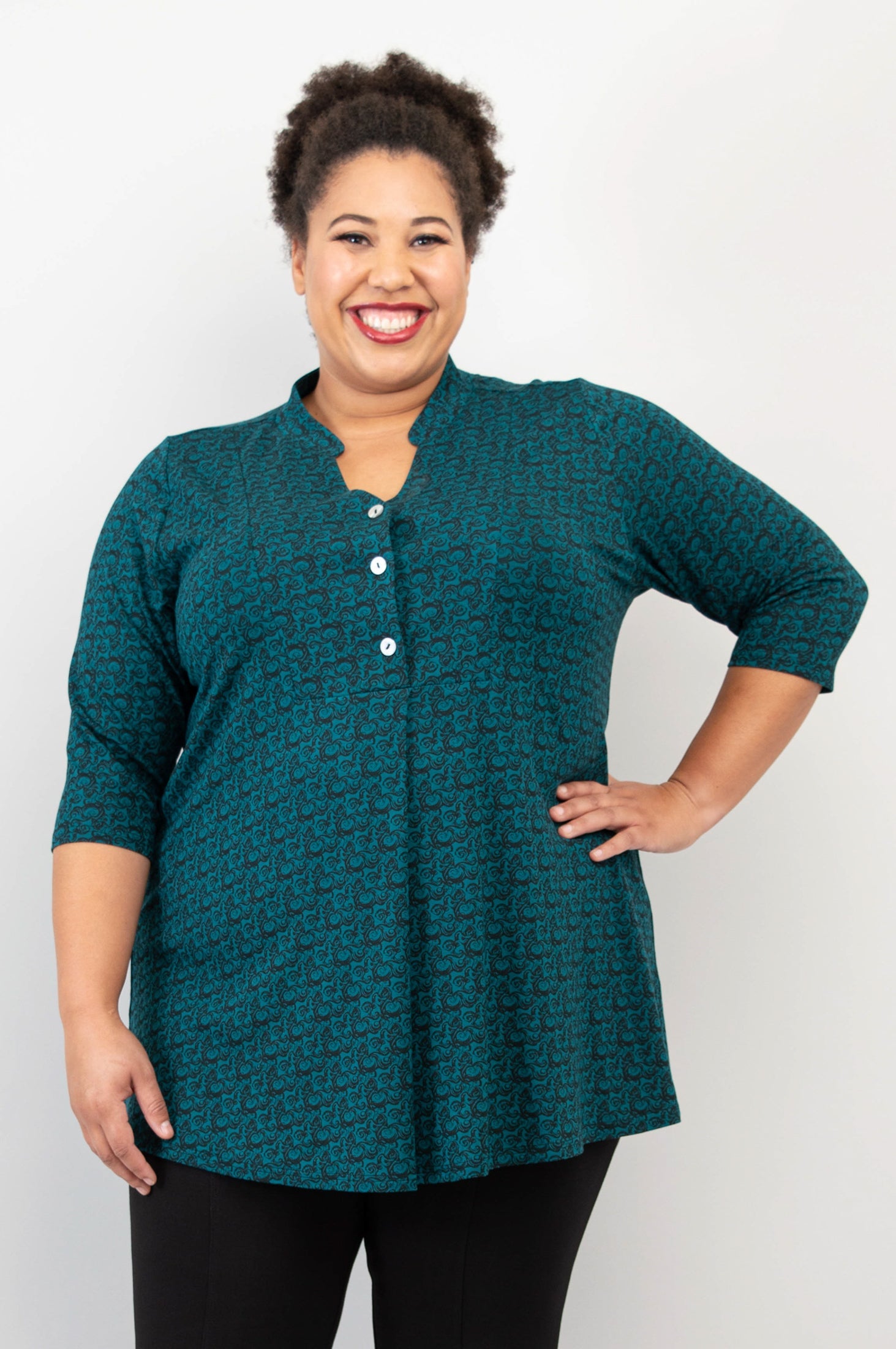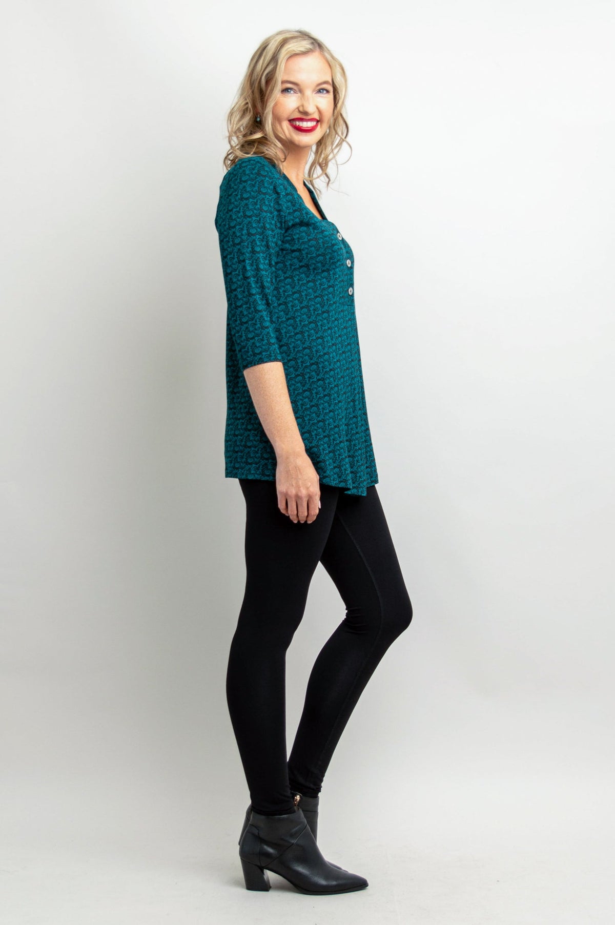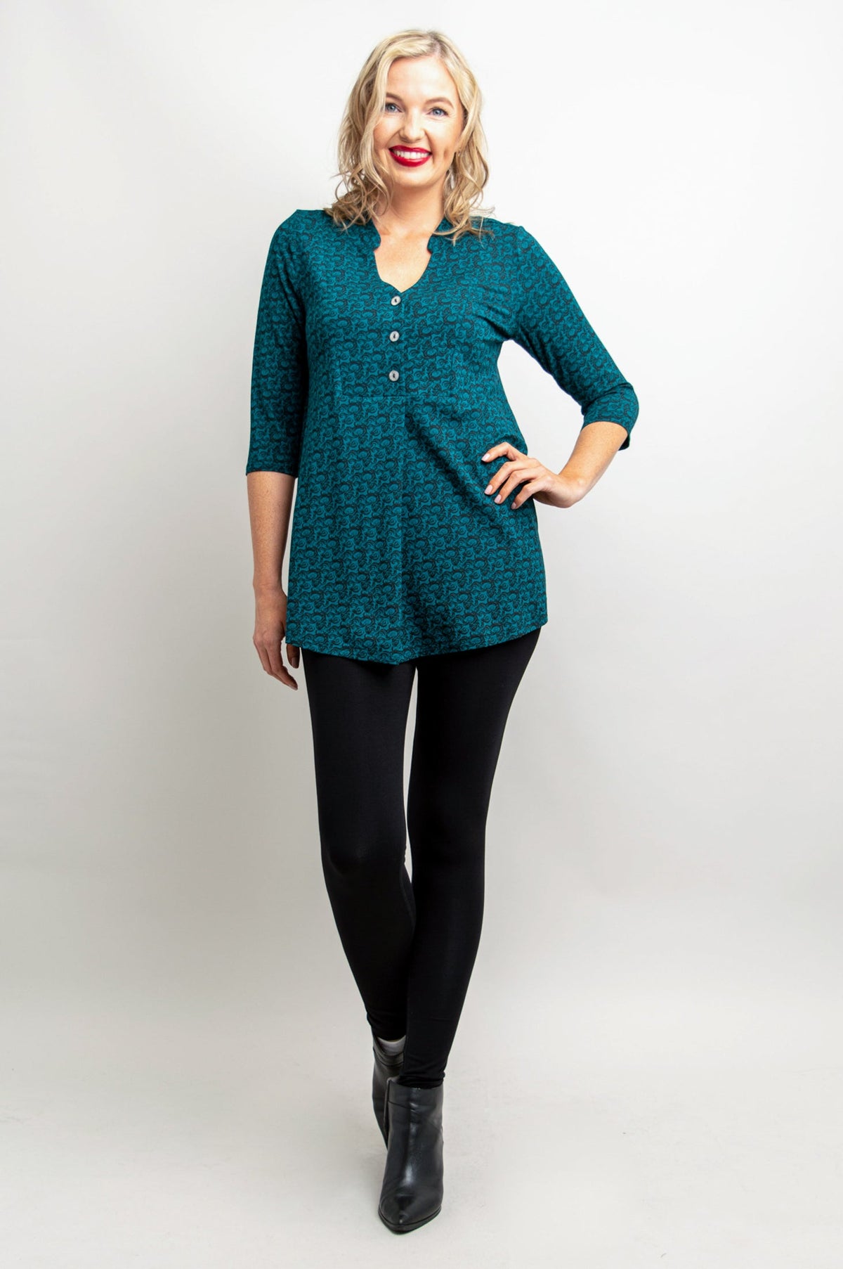 The Edwina is pullover style top made in our soft, breathable Bamboo fabric. It features a V-neck, 3/4 sleeves and a 3 button placket.