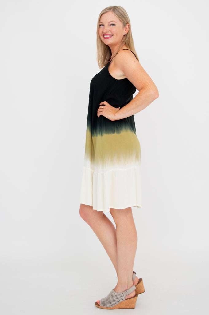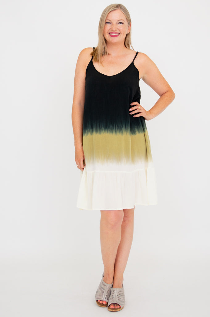 This lightweight, tiered dress falls just above the knee. With a Boho vibe, this will be your go to for warm days and tropical vacations!The adjustable spaghetti straps and scooped neckline make room to showcase your favourite statement jewelry!