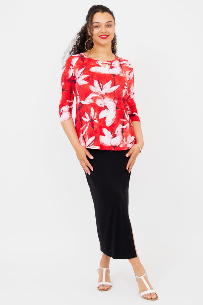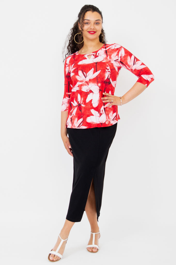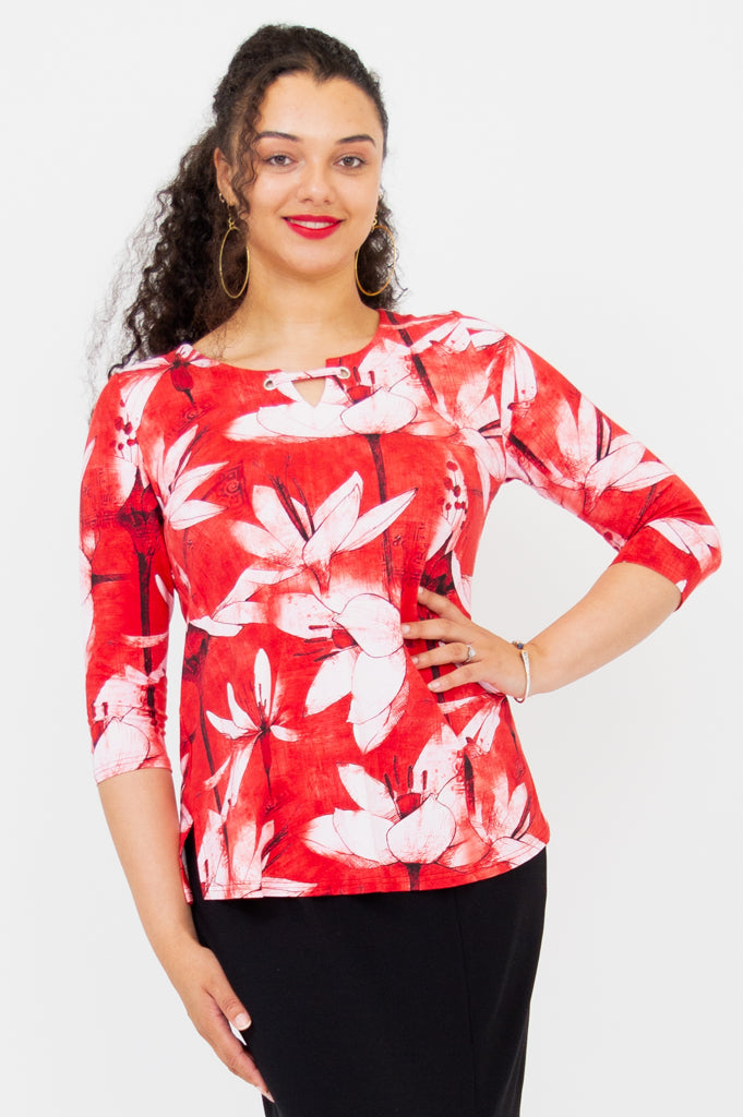 The Gemi is a classic 3/4 sleeve top with an added detail at the neckline. The tab with silver gromets gives this top a little added flair.