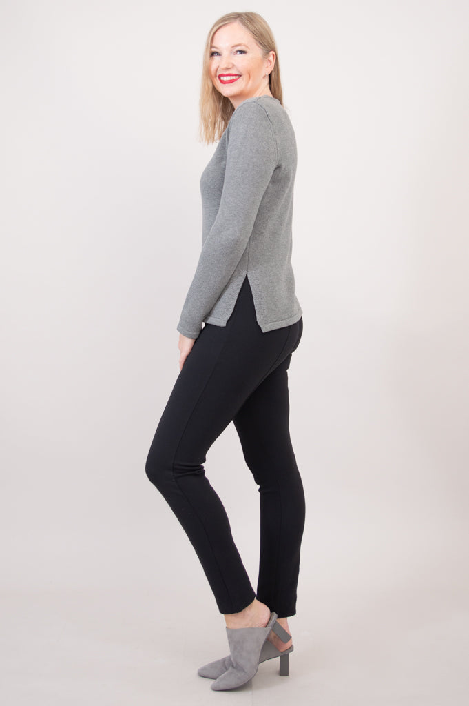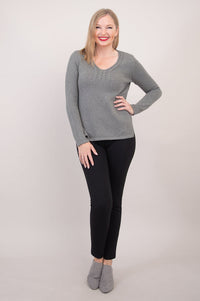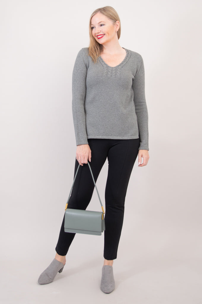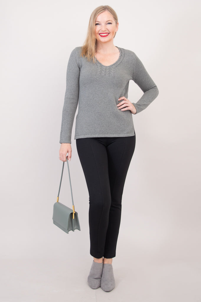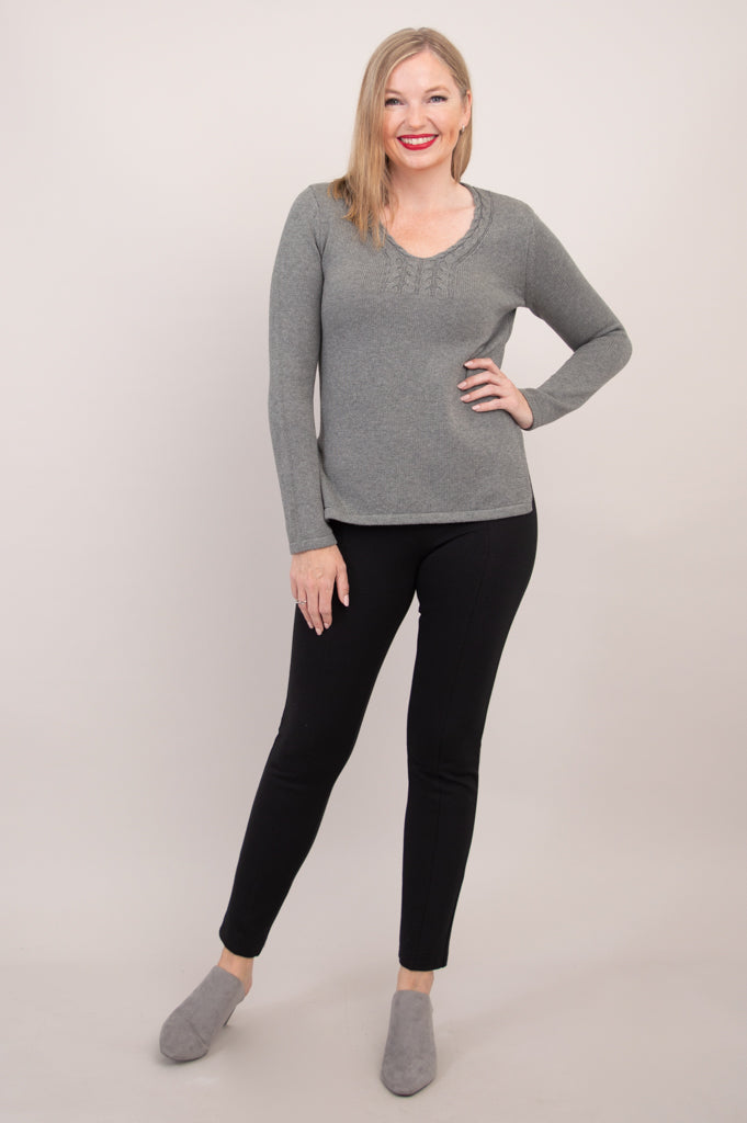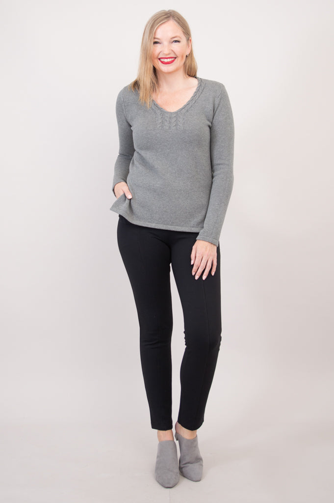 The Muni Sweater is an elegant addition to any wardrobe. With subtle cable knit detailing at the bust and a slight v-neckline, this sweater is easy to dress up or dress down with any outfit! The side seam slits allow for freedom of movement while still adding additional layers to your look.