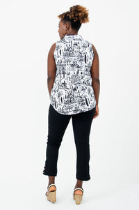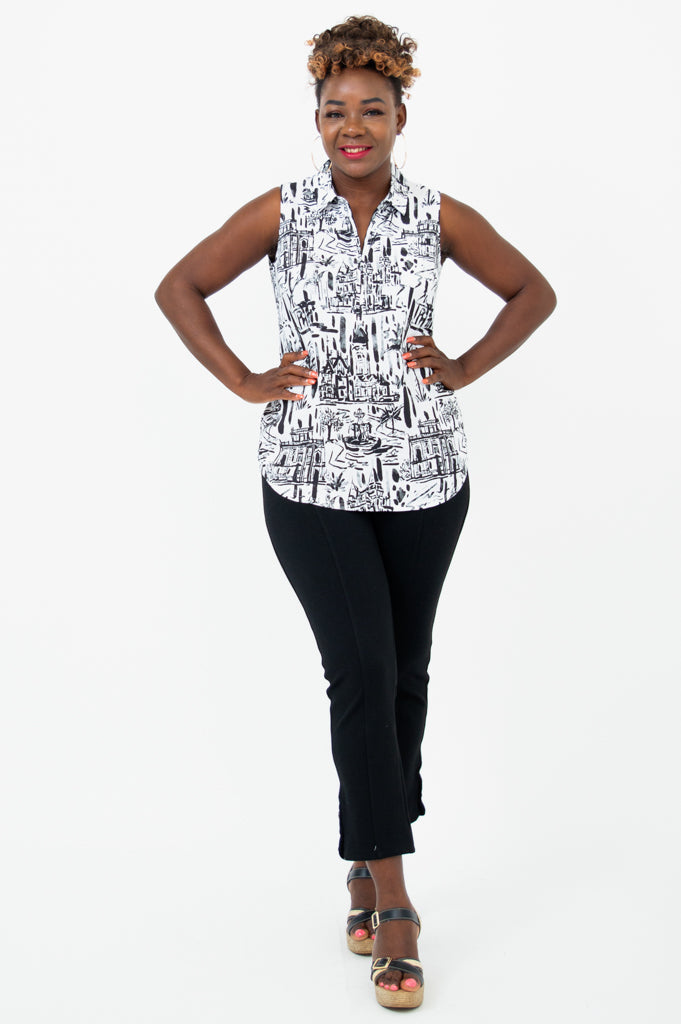 The Hula tank features a quarter zipper allowing for an adjustable V-neck or a collared neckline. The curved hemline gives the tank a relaxed fit. Pair with loose-fitted pants for a casual yet sophisticated look.