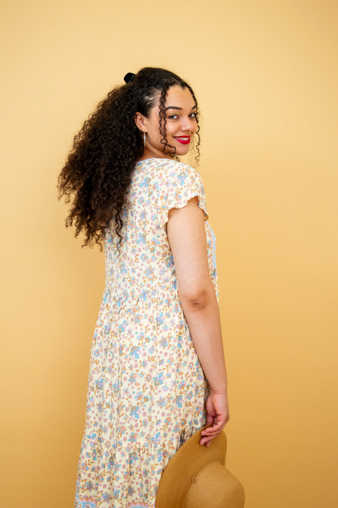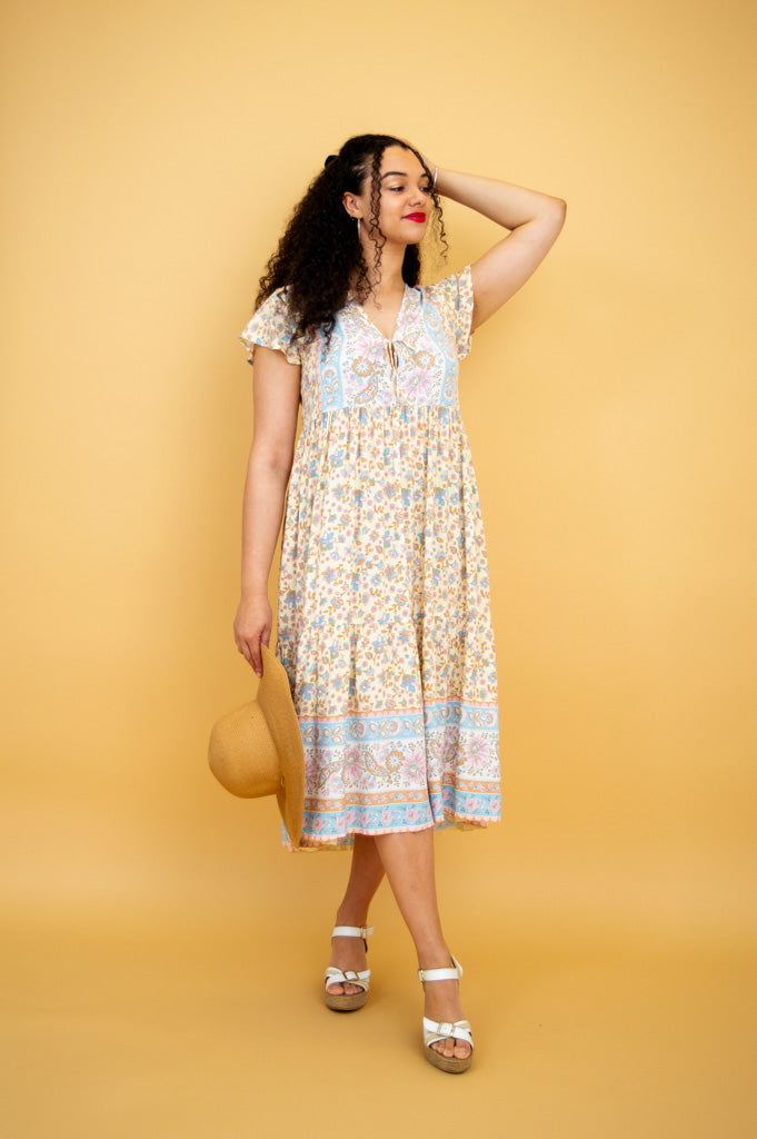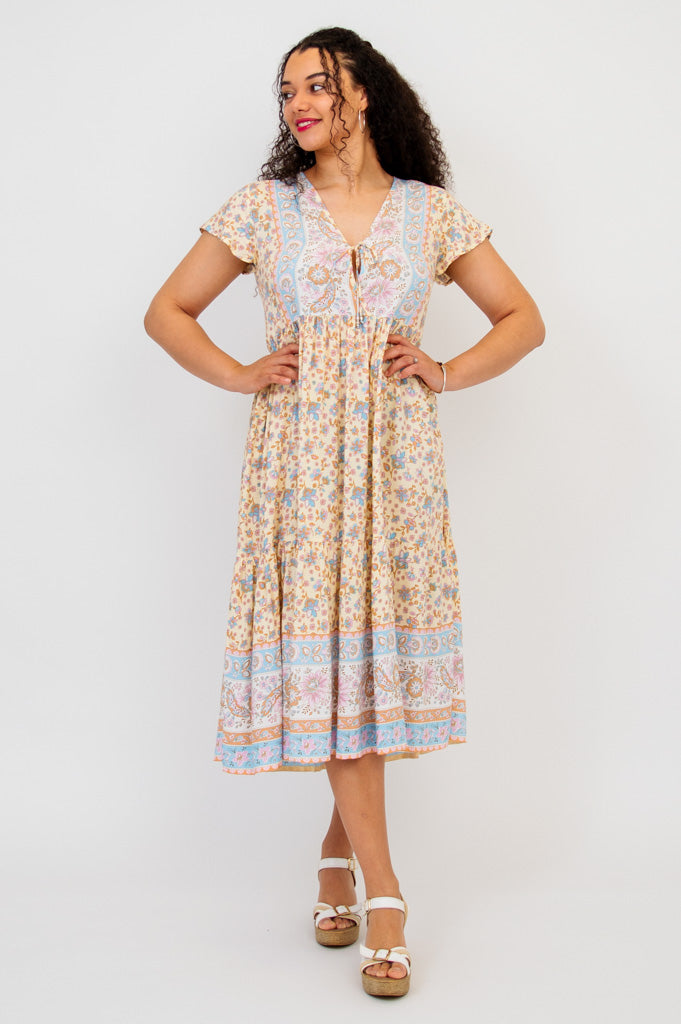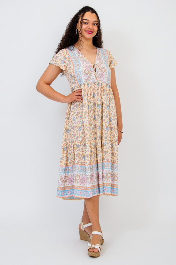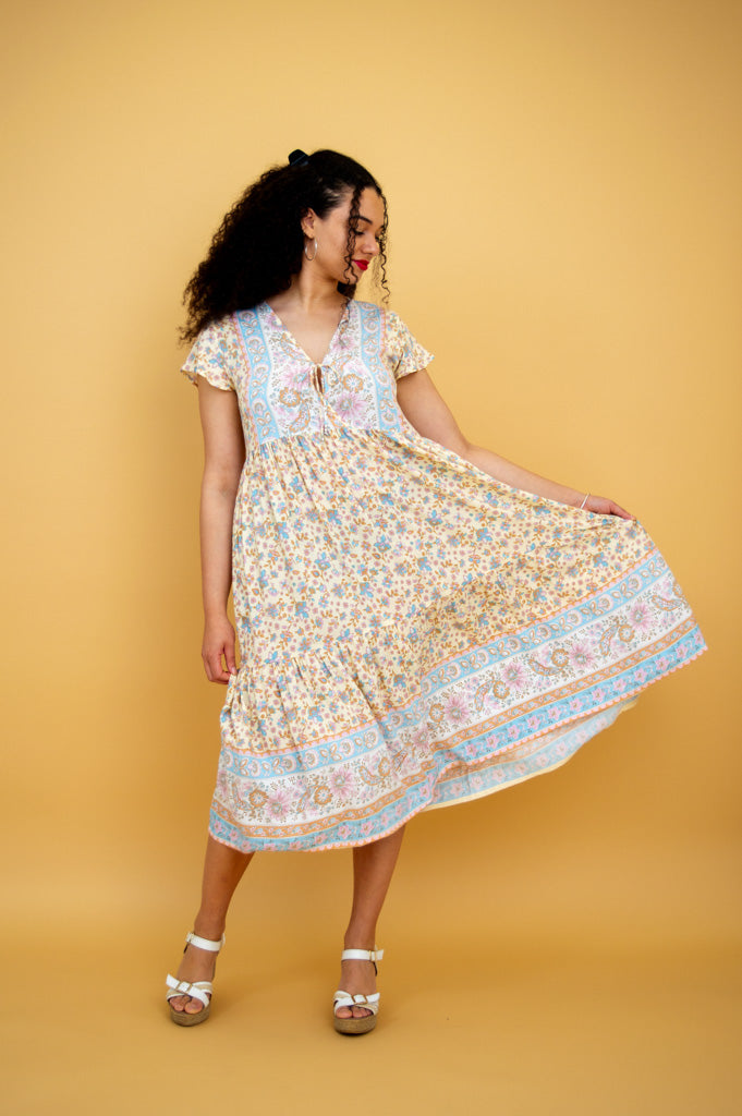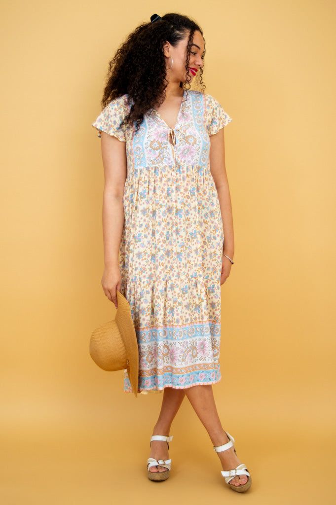 Feminine style with flow. The Julie Dress features a surplice style bodice, with short sleeves and a tiered skirt. A decorative tie sits at the base of the v-neckline, and the short sleeves flare away from the shoulder. The tiered skirt starts at the waist and cascades down the body to the mid-calf.