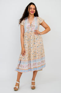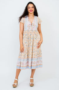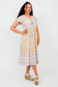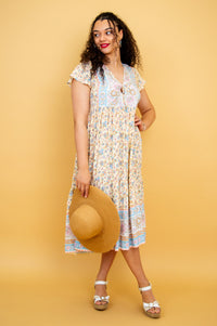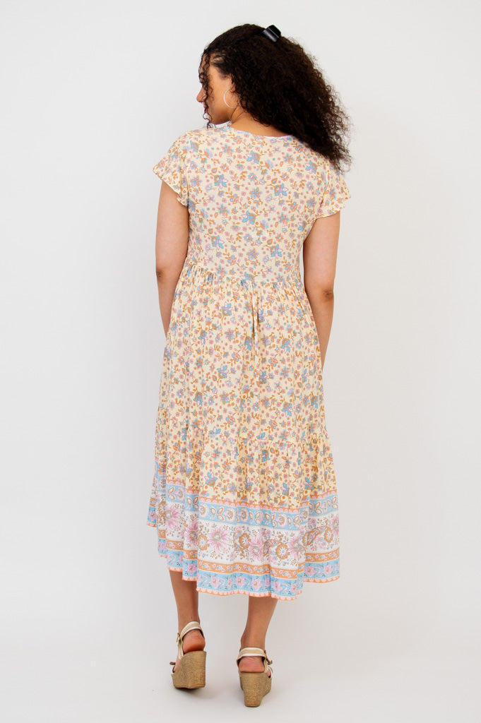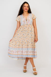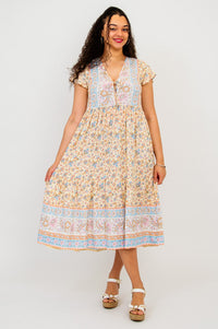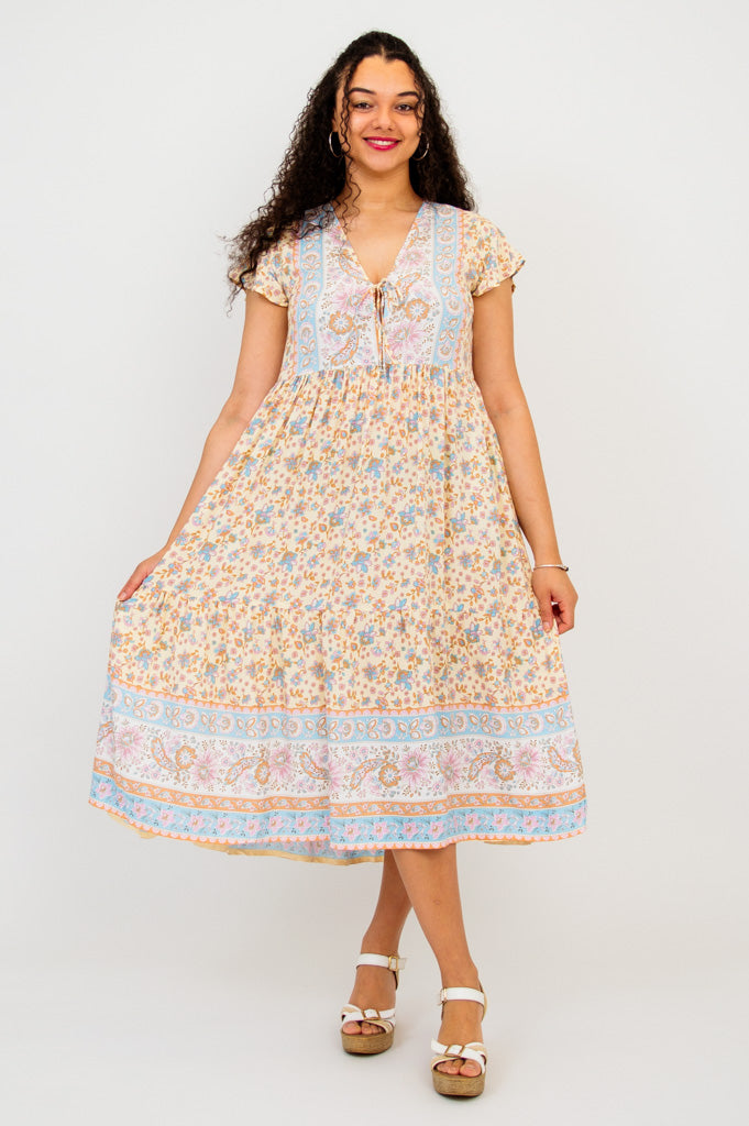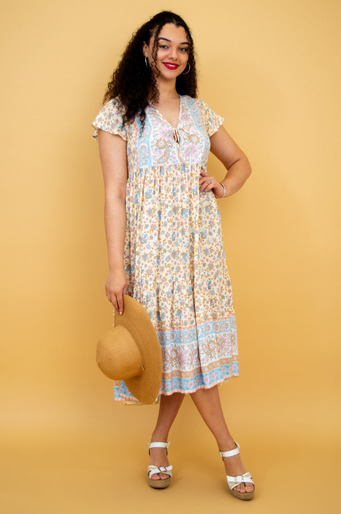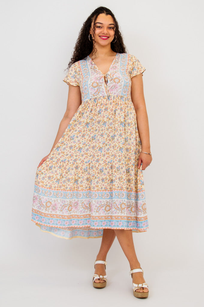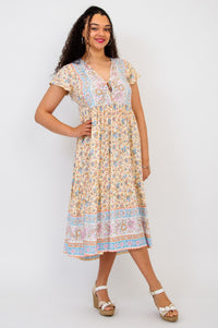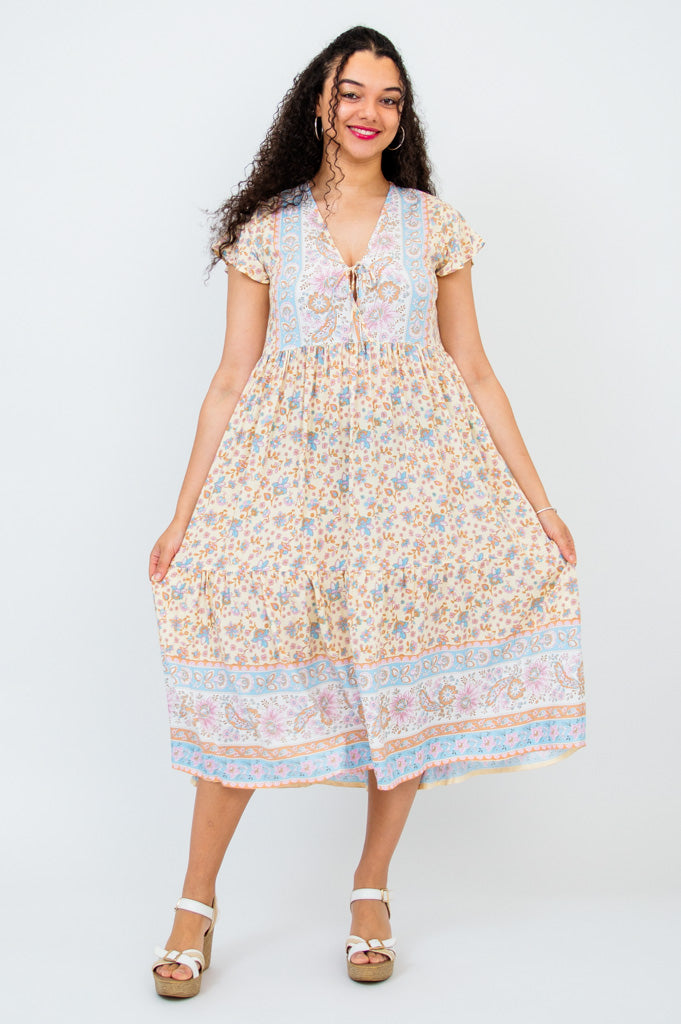 Feminine style with flow. The Julie Dress features a surplice style bodice, with short sleeves and a tiered skirt. A decorative tie sits at the base of the v-neckline, and the short sleeves flare away from the shoulder. The tiered skirt starts at the waist and cascades down the body to the mid-calf.