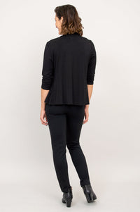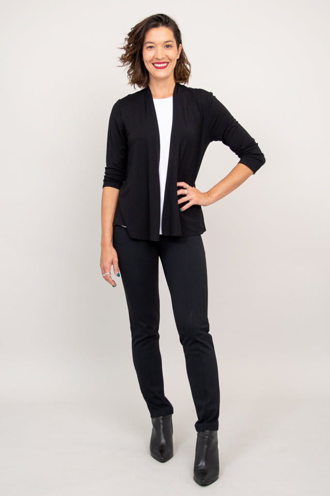 The Kathy is a great layering piece. An open jacket, it is fitted through the arms. Falling from the shoulder, it tapers at the waist and flares slightly around the hip. The front panels add movement coverage. The subtle shaping flatters the body, and allows flow. The Kathy Jacket works well with sleeveless tops or dresses, and a wide variety of bottoms.