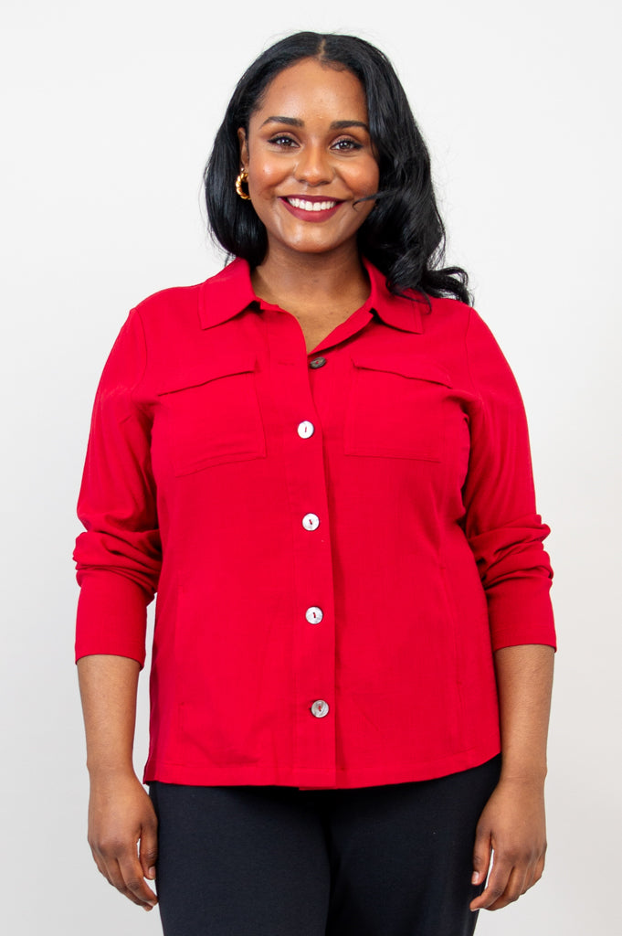 Includes two breast pockets and a collared neckline. Full button-up for convenience. Hemline falls at the waist creating a box-shaped silhouette. Great to layer over dresses and casual outfits.