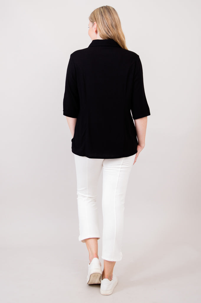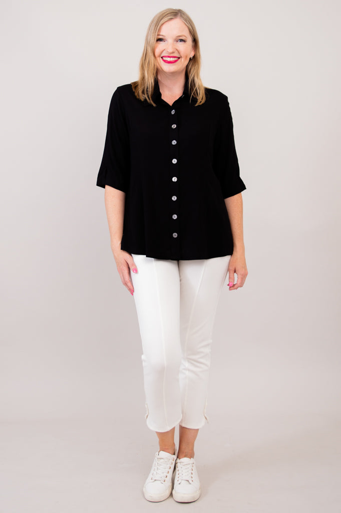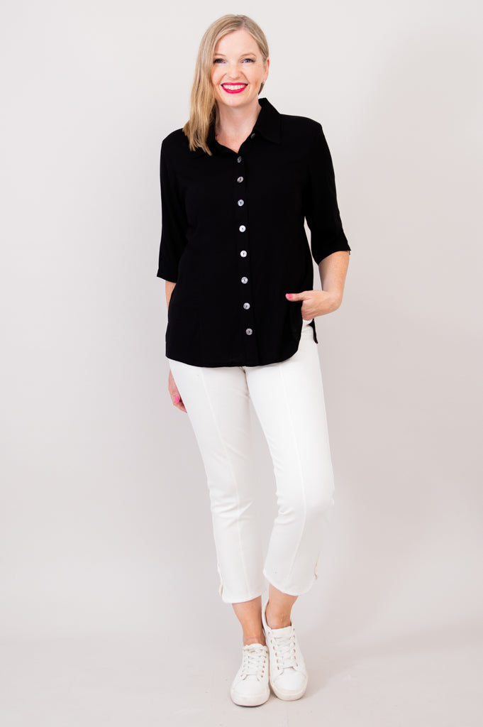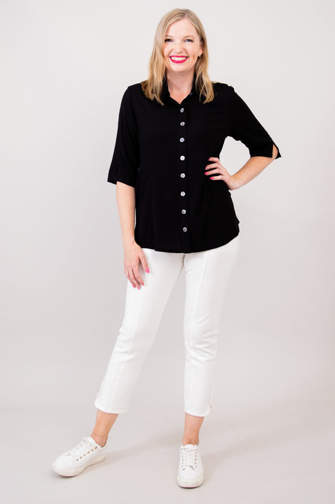 A tailored blouse in cool, breathable Bamboo/Linen fabric. The Lorine features a shirt collar and princess seams. The sleeve falls just below the elbow with a small slit. Pairs nicely with a pant or skirt.