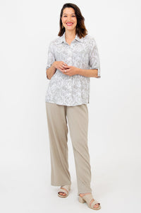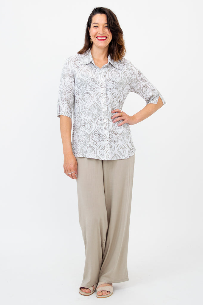 A tailored blouse in cool, breathable Bamboo/Linen fabric. The Lorine features a shirt collar and princess seams. The sleeve falls just below the elbow with a small slit. Pairs nicely with a pant or skirt.
