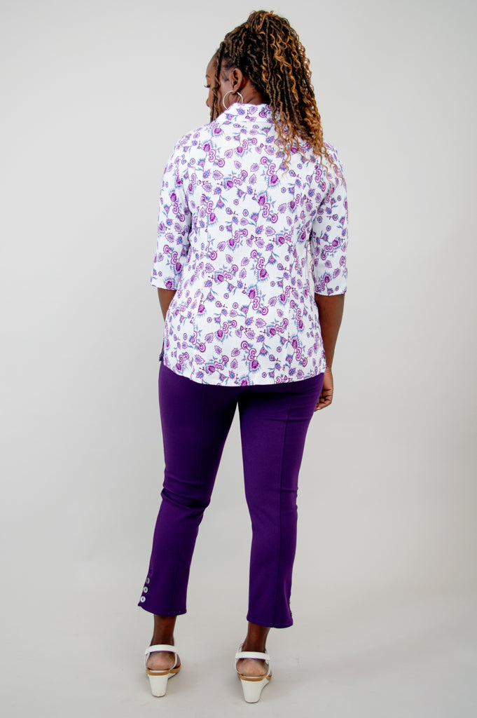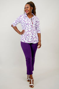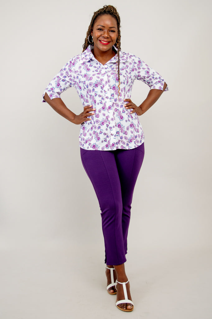 A tailored blouse in cool, breathable Bamboo/Linen fabric. The Lorine features a shirt collar and princess seams. The sleeve falls just below the elbow with a small slit. Pairs nicely with a pant or skirt.
