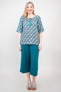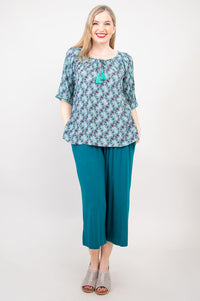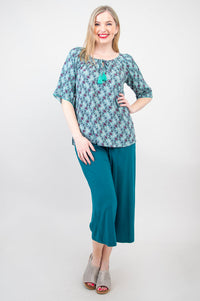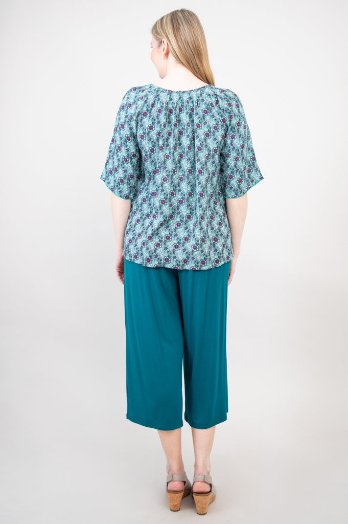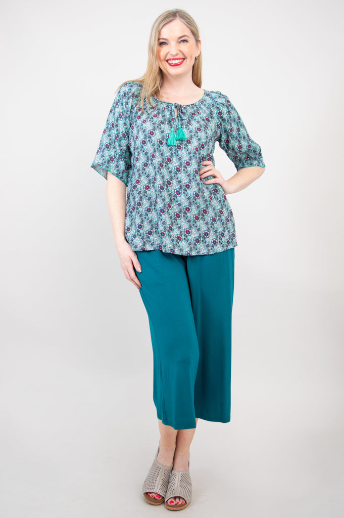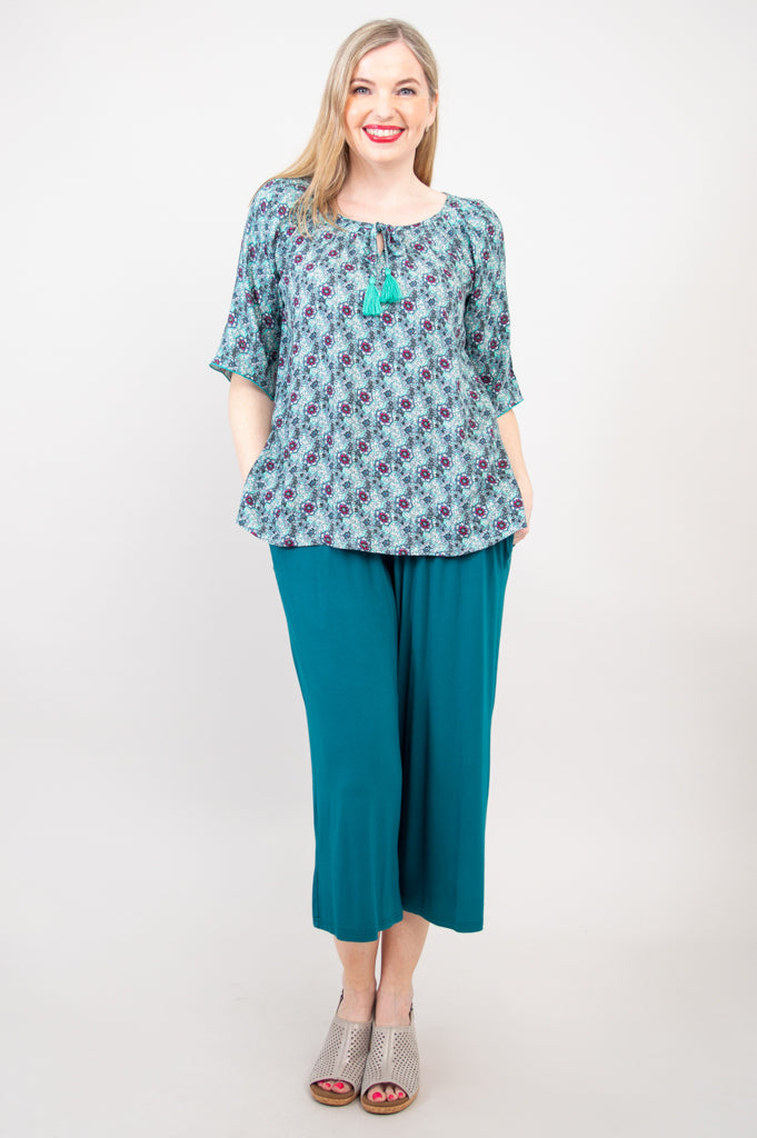 A peasant-style top with a boho look. The Luna has a generous neckline that frames the face, and tie-front detail. Darts all around create drape, and 3/4 length sleeves are loose and flowy.