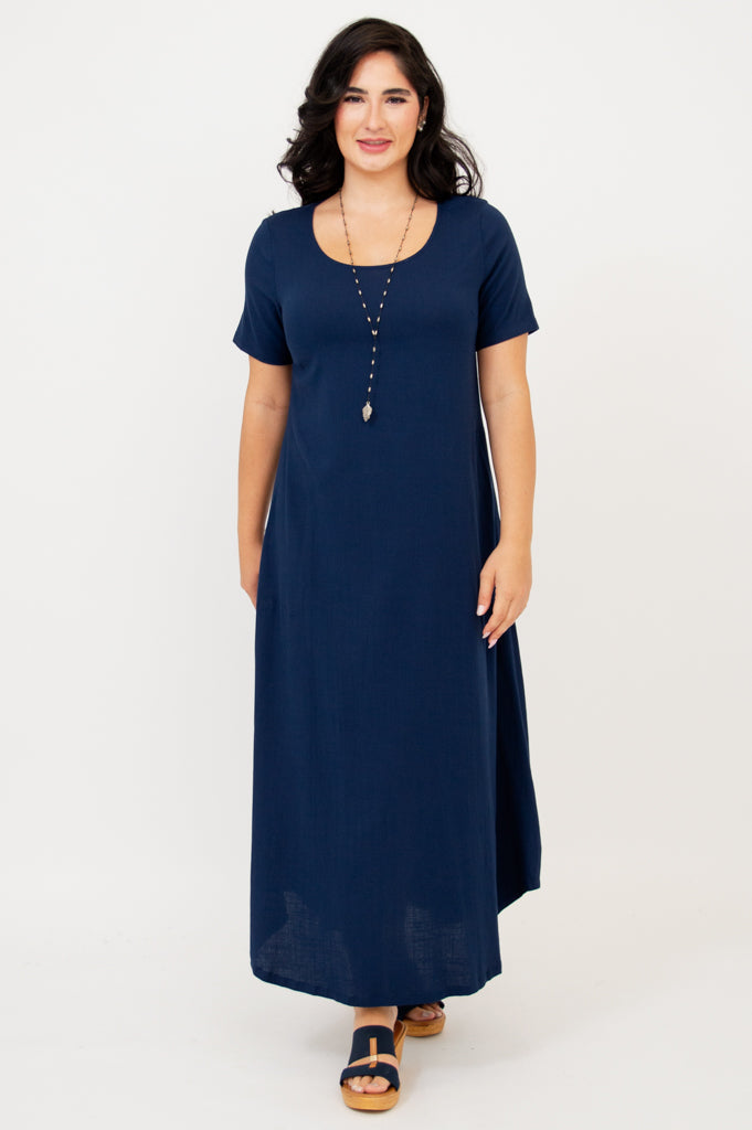 The Martha is a flowing maxi style dress that looks effortless. It features short sleeves, pockets and a rounded hemline.