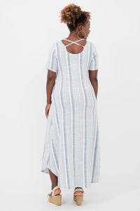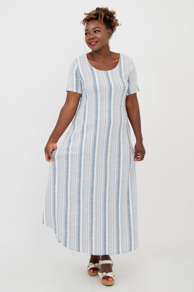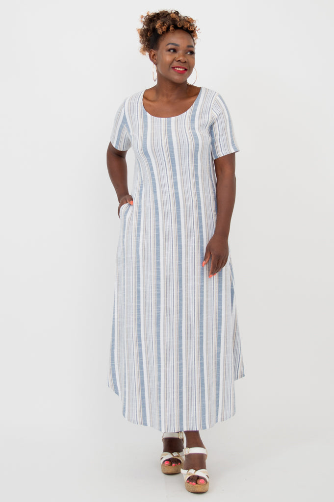 The Martha is a flowing maxi style dress that looks effortless. It features short sleeves, pockets and a rounded hemline.