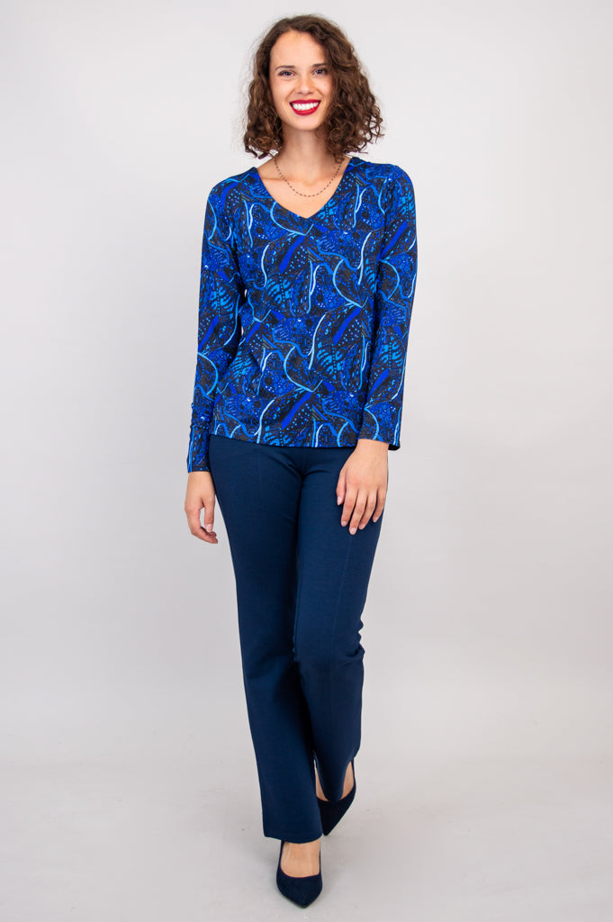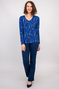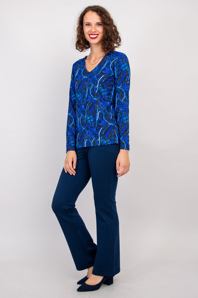 Flattering whether worn loose or body-con. The Mia Top is made of stretchy Bamboo, and has two layers in the front for added structured. Bamboo is cool, so this double layer remains a comfortable option. A soft V-neckline suggests a vertical axis, and aligns with tapered shape down the body. T-shirt simplicity with a very shapely fit, the Mia a great choice for pairing with a variety of different pants and skirts.
