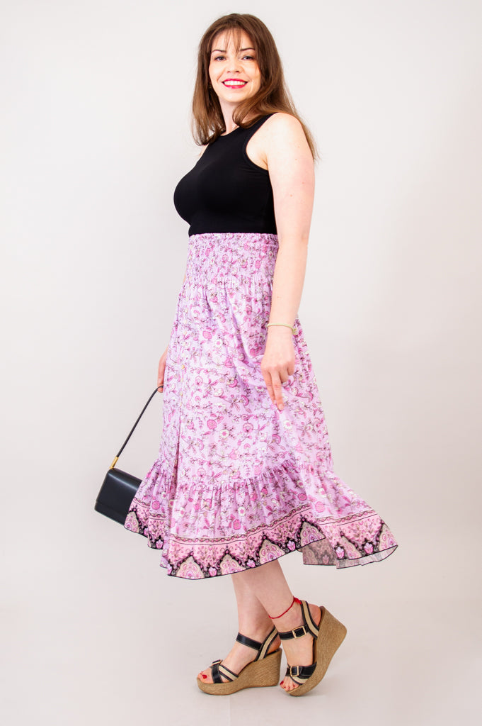 The elastic waistband makes for a cascade of gathers and texture in the skirt, with the bottom tier gathering again to create additional movement. The side slit on the side adds to the delicate details of this flattering garment.