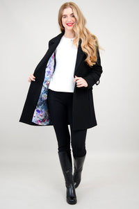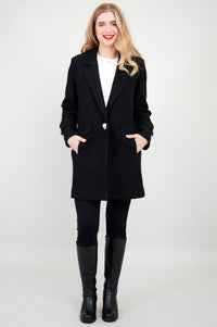 The Milan Coat is single-breasted with one-button closure and a notched lapel. Decorative button flaps at the wrists match the closure button. Faux flaps on the front hide generous inseam pockets and maintain a sleek look. The hemline of the coat falls to mid-thigh, ensuring full coverage of the hips. Wear the Milan with a turtleneck sweater and boots for a chic, city look.
