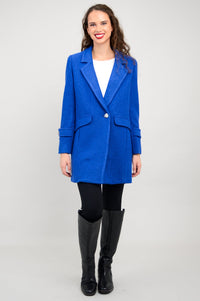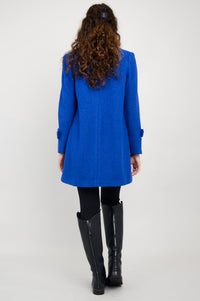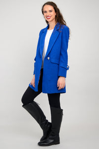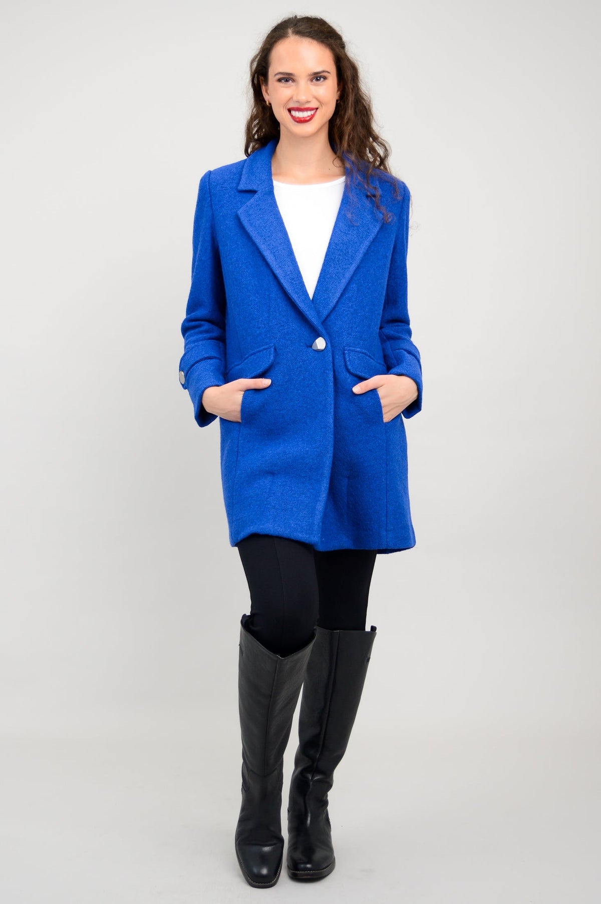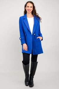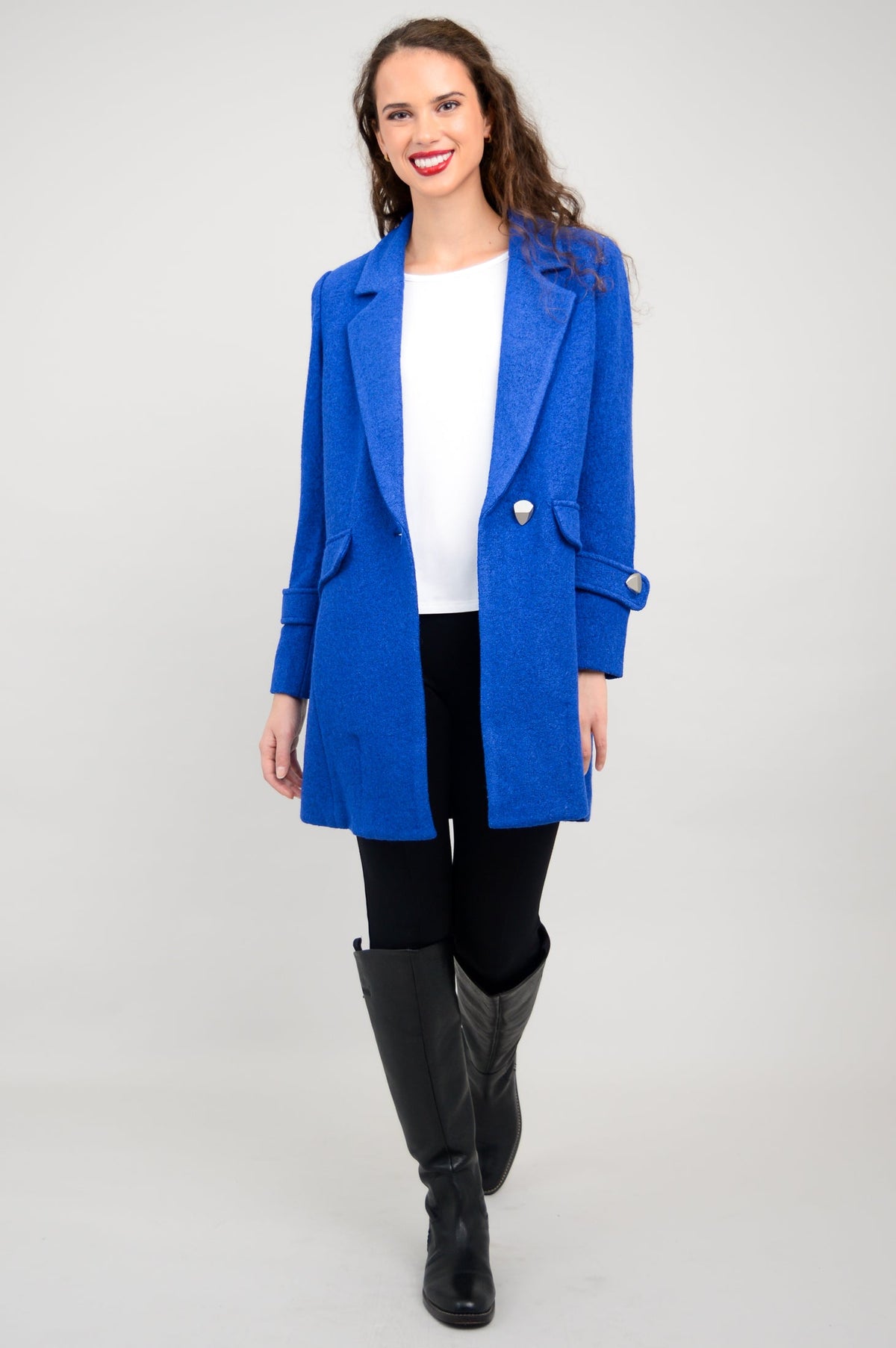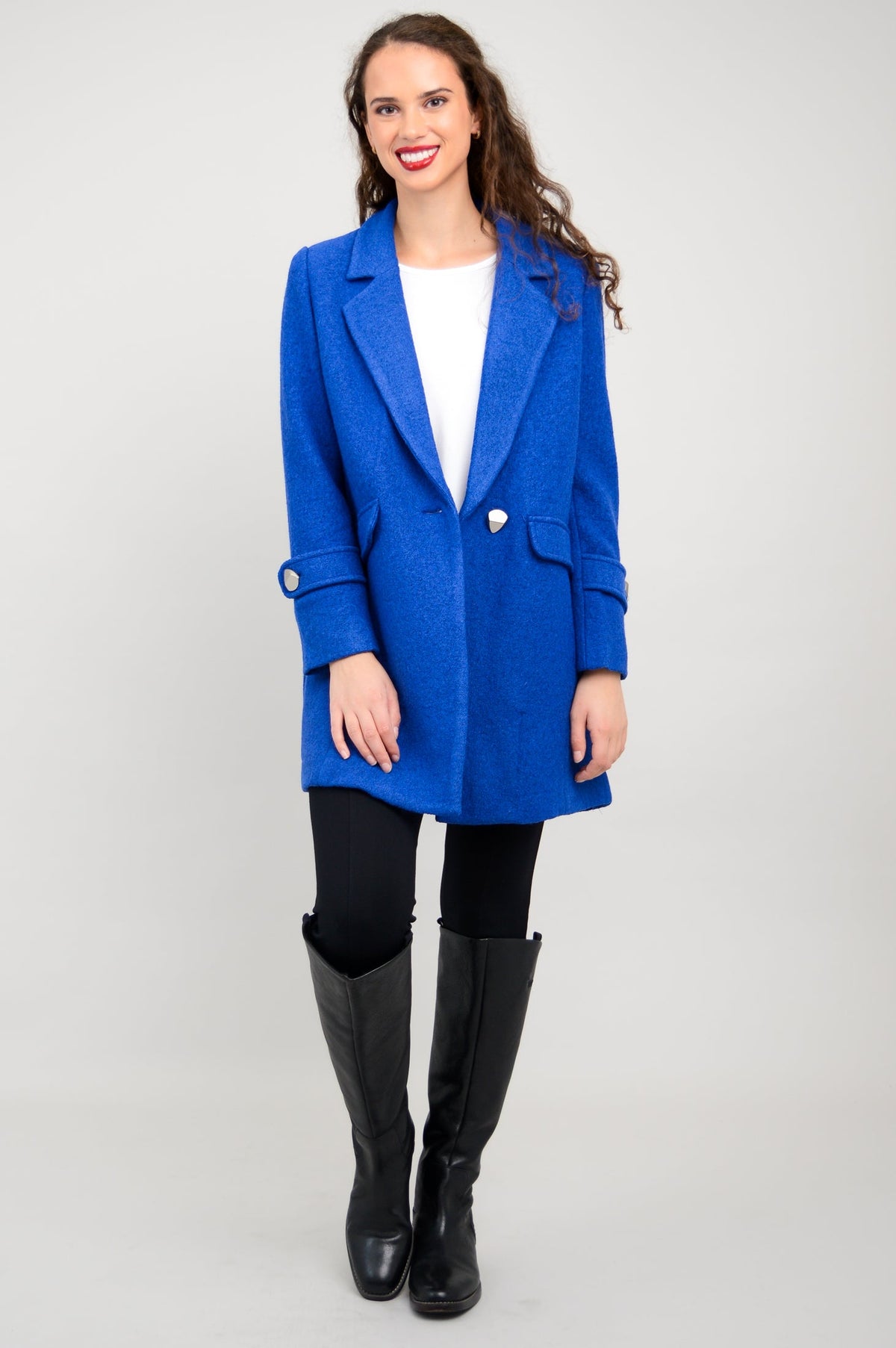 The Milan Coat is single-breasted with one-button closure and a notched lapel. Decorative button flaps at the wrists match the closure button. Faux flaps on the front hide generous inseam pockets and maintain a sleek look. The hemline of the coat falls to mid-thigh, ensuring full coverage of the hips. Wear the Milan with a turtleneck sweater and boots for a chic, city look.