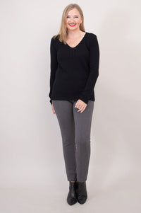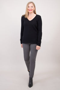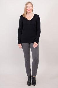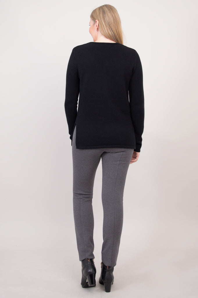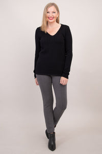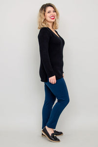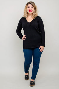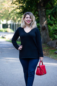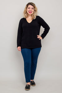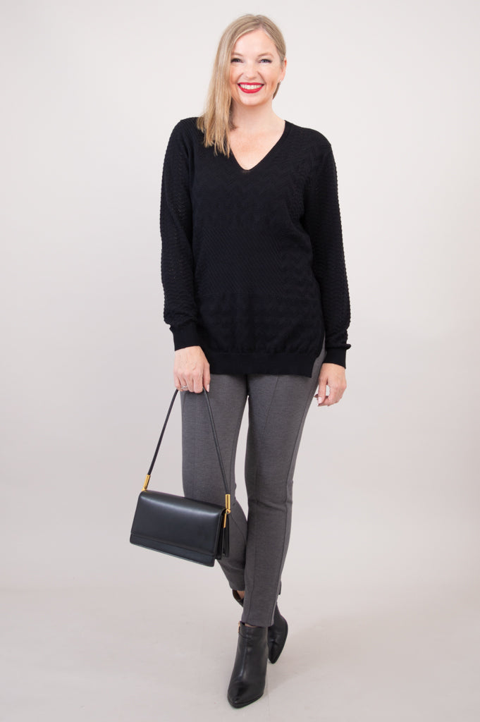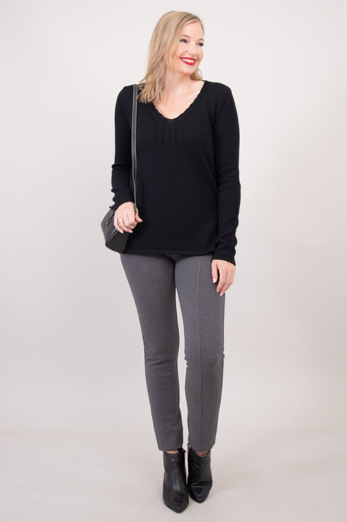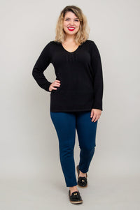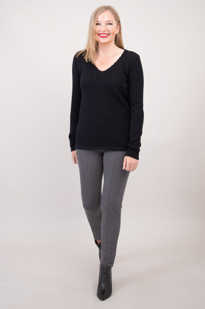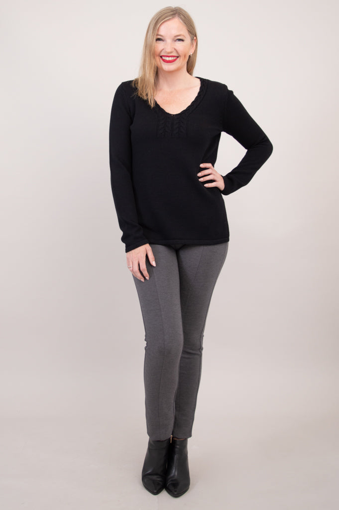 The Muni Sweater is an elegant addition to any wardrobe. With subtle cable knit detailing at the bust and a slight v-neckline, this sweater is easy to dress up or dress down with any outfit! The side seam slits allow for freedom of movement while still adding additional layers to your look.