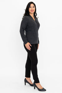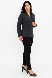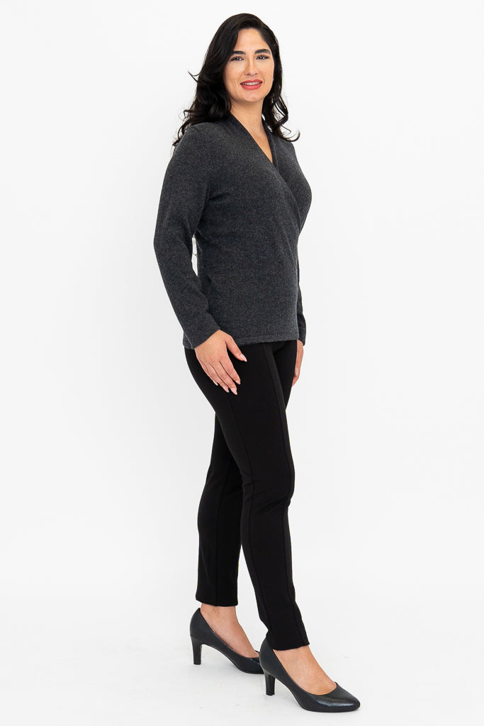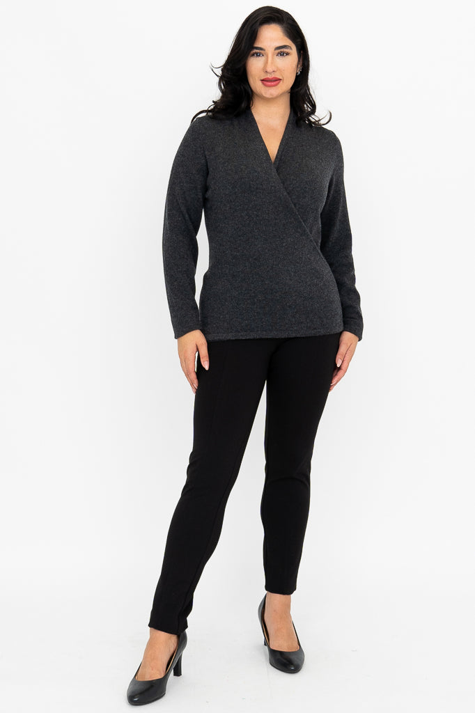 Cozy Cashmere in a feminine, chic style. The New York Sweater has a surplice neckline that creates a high V-neckline, and long sleeves. Perfectly fitted, you can wear a coat or vest over top, and pair it with slim pants or a skirt as well.