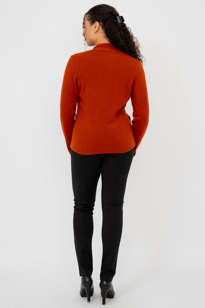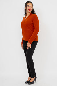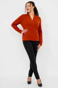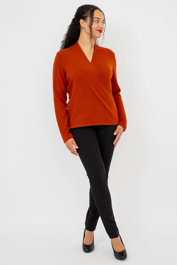 Cozy Cashmere in a feminine, chic style. The New York Sweater has a surplice neckline that creates a high V-neckline, and long sleeves. Perfectly fitted, you can wear a coat or vest over top, and pair it with slim pants or a skirt as well.