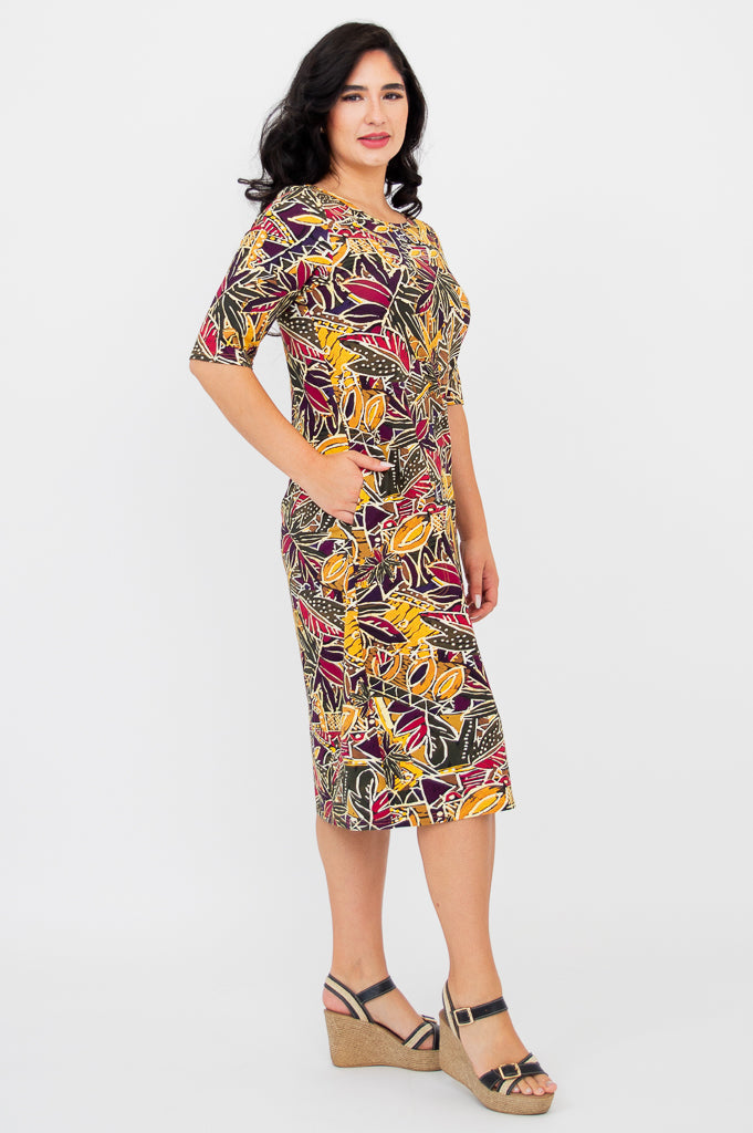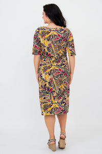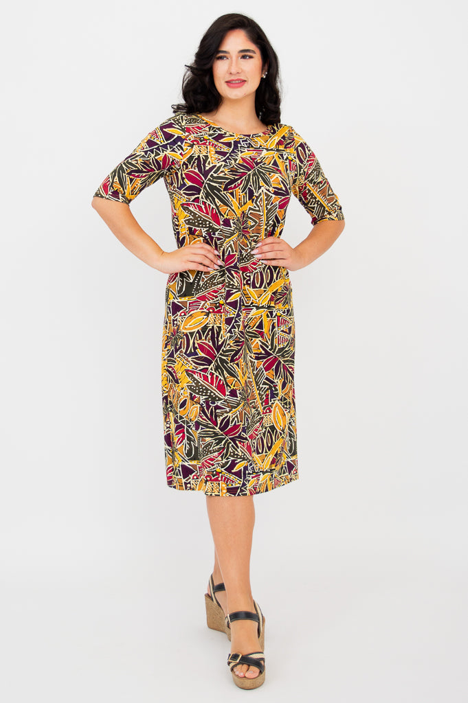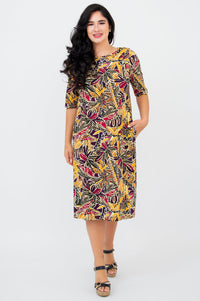 The Olivia dress in Tropikal is made of our soft Bamboo/Cotton blend and is oh so comfortable. Elbow length sleeves and pockets make it practical for every day.