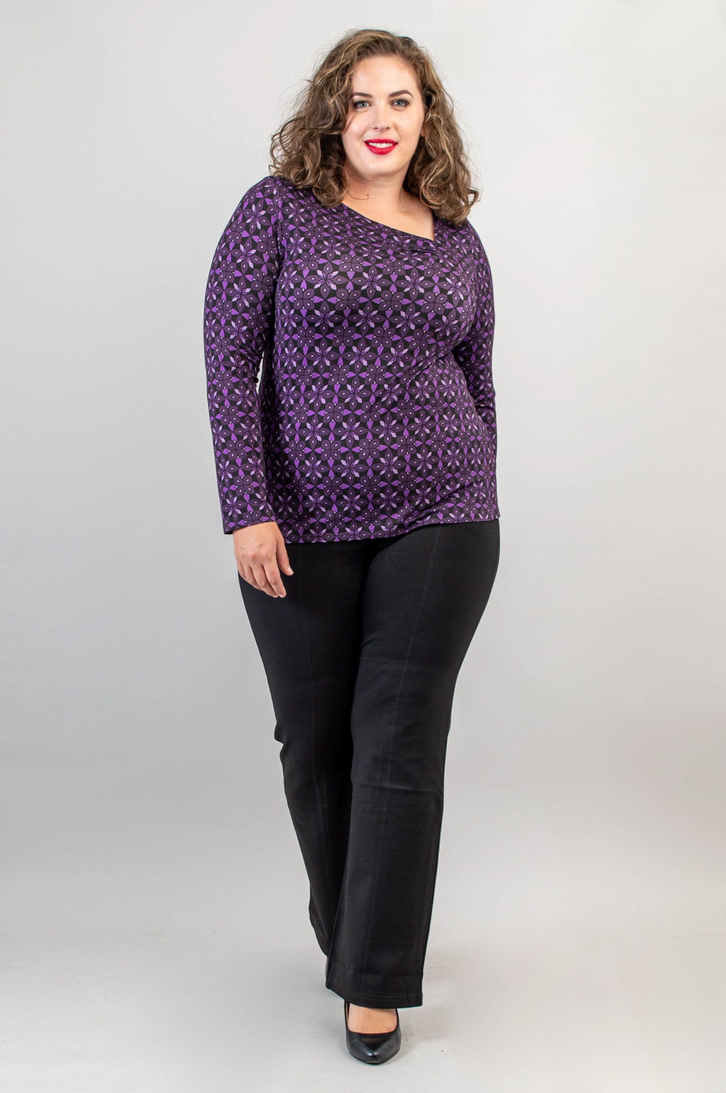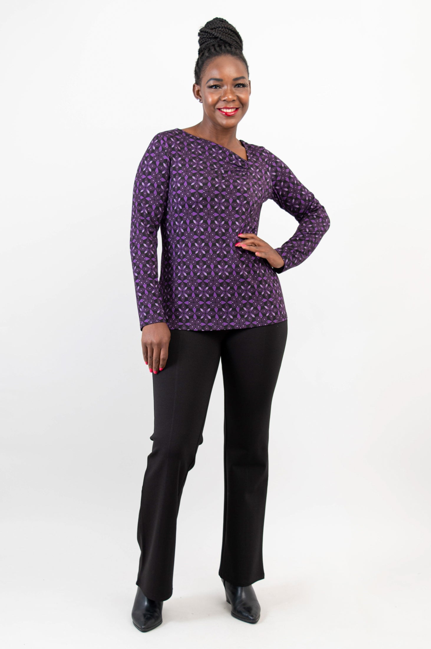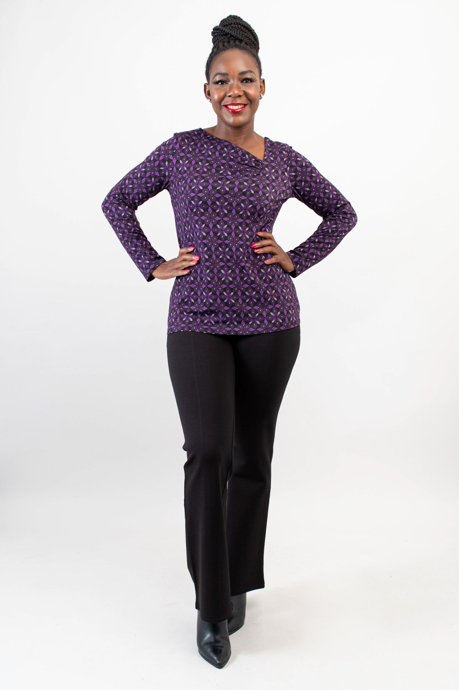 The Ruth is a truly flattering garment. All the coverage of a long sleeve top, plus an asymmetrical neckline that draws the eye up. The style of this top means little accessorizing is needed. Pair with slim pants and tall boots for a sleek, clean look.