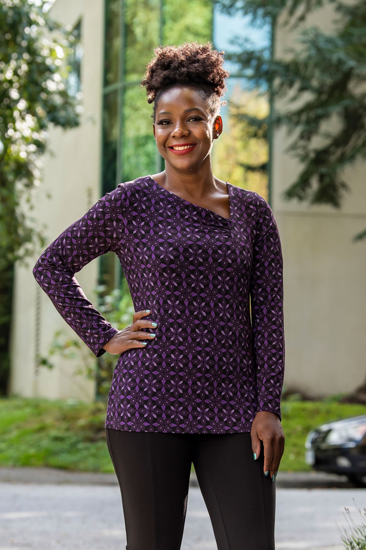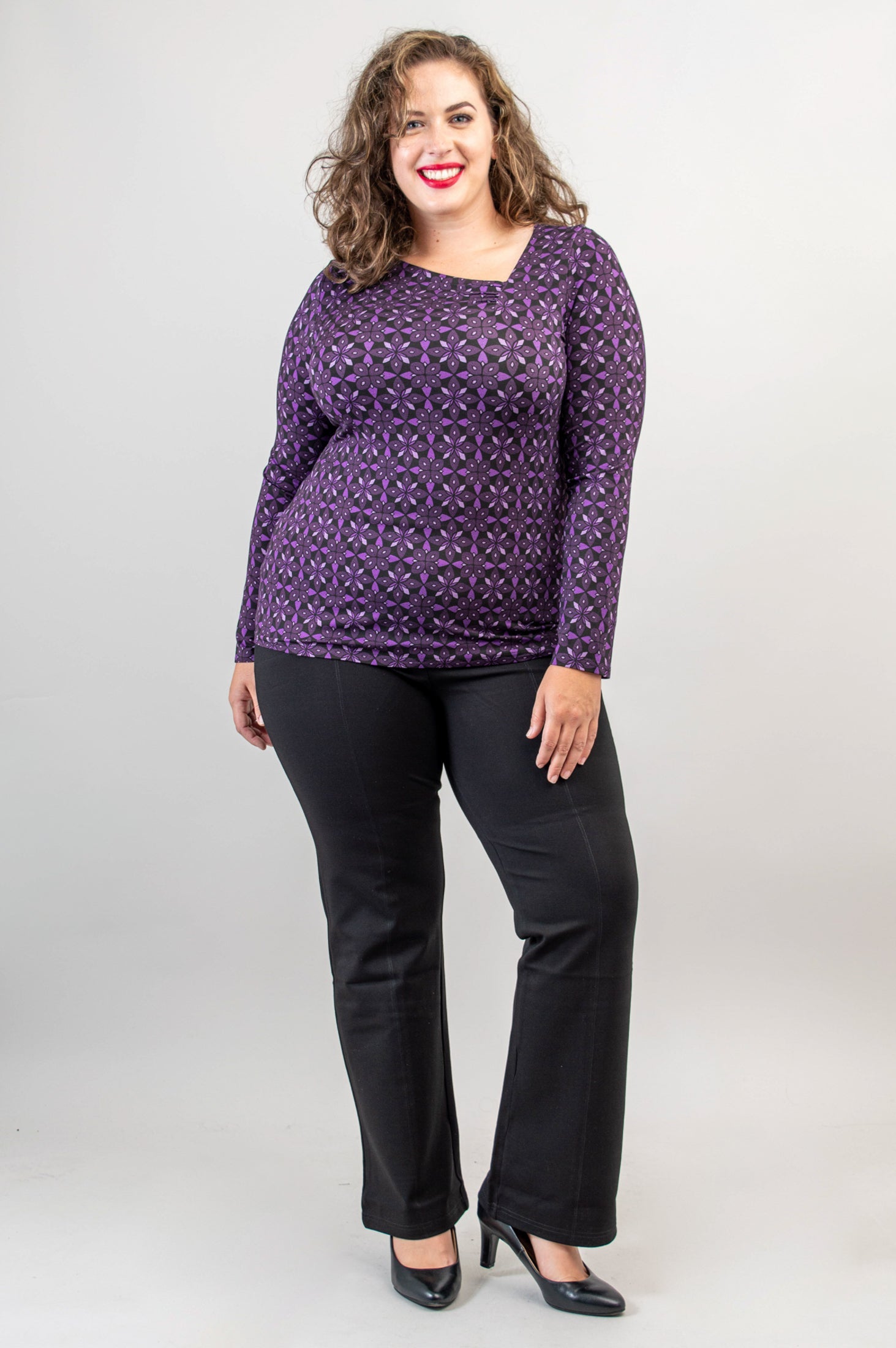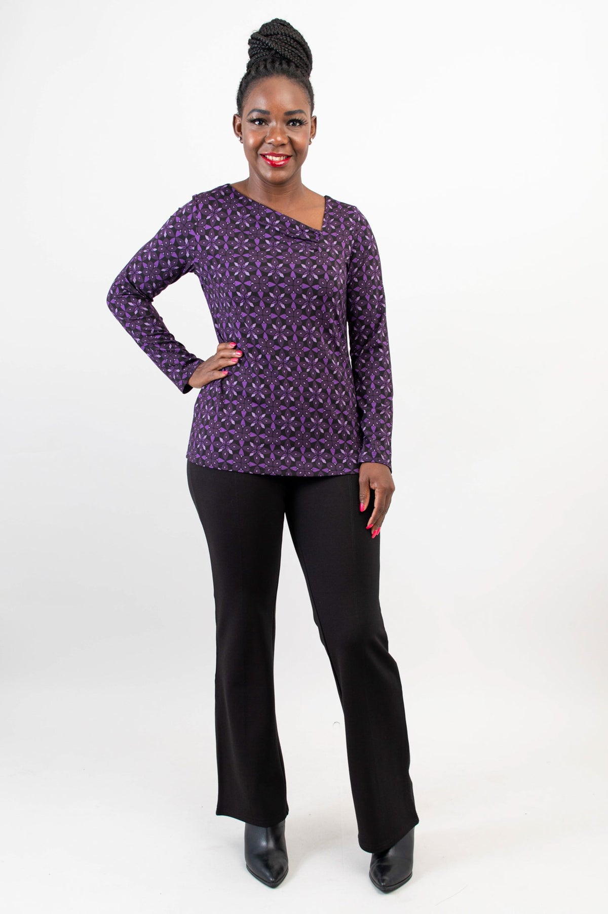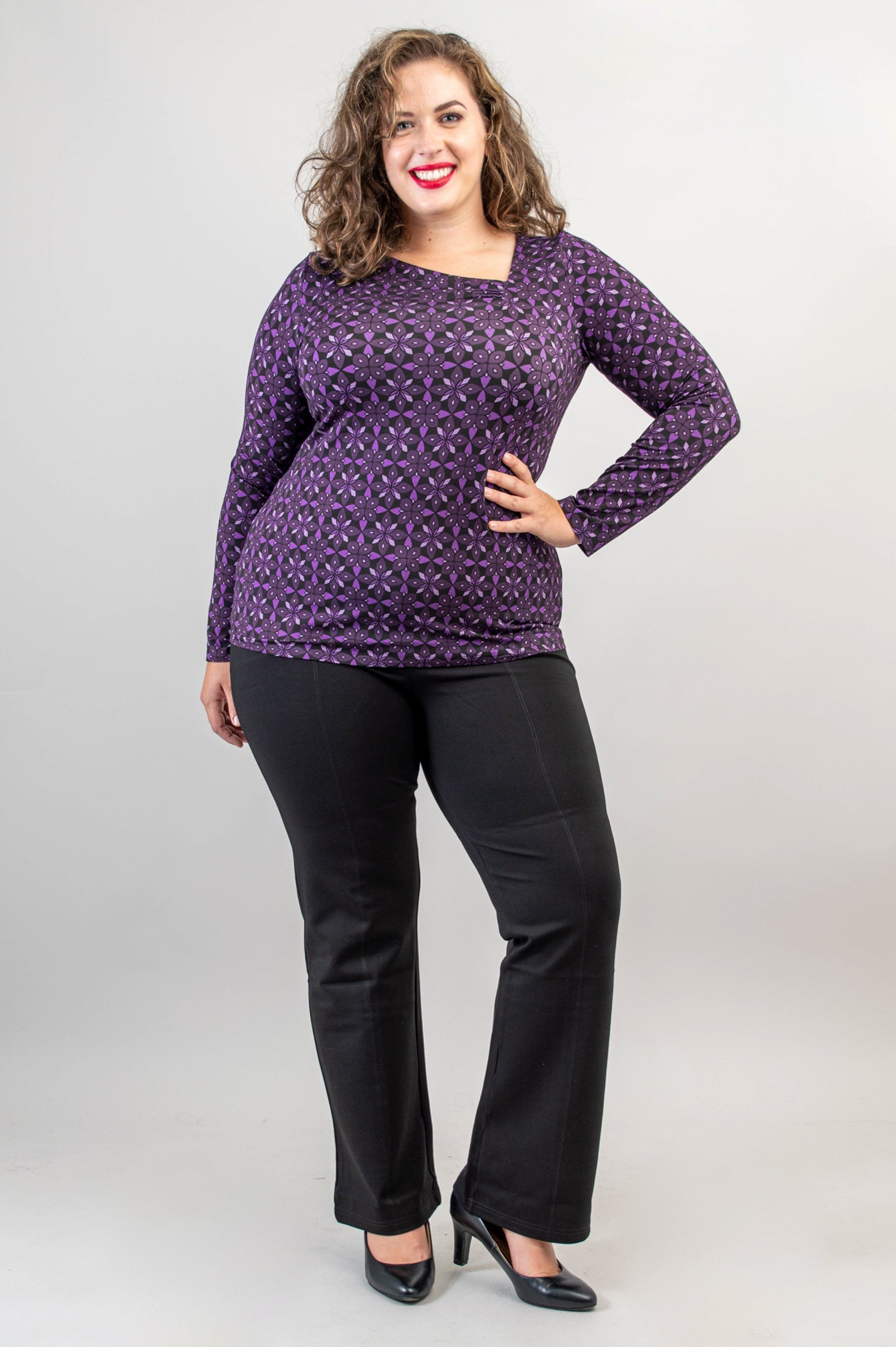 The Ruth is a truly flattering garment. All the coverage of a long sleeve top, plus an asymmetrical neckline that draws the eye up. The style of this top means little accessorizing is needed. Pair with slim pants and tall boots for a sleek, clean look.