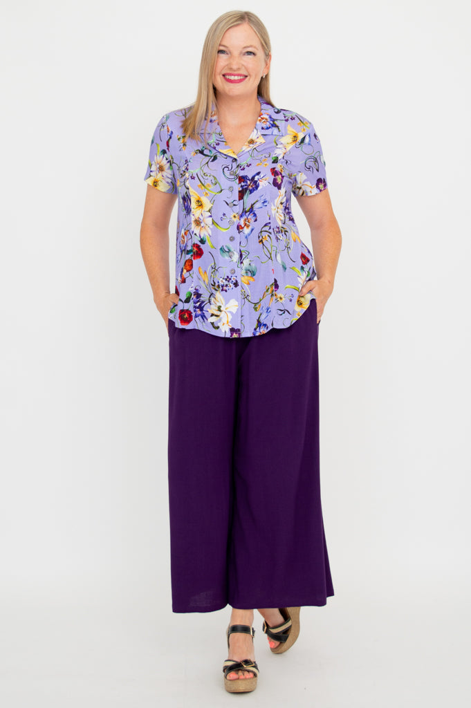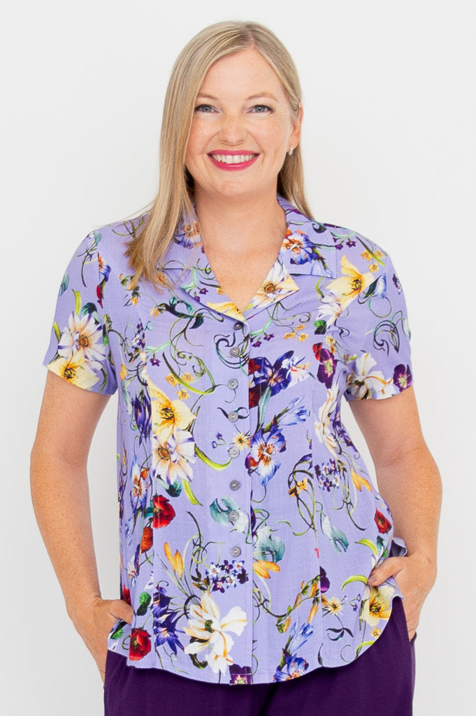 Soft, breathable Linen/Bamboo fabric in a tailored shirt style.  The Samantha is great paired with capri pants or layered under a cardigan on cooler days. You can even wear it unbuttoned, for a cool shirt-jacket look.