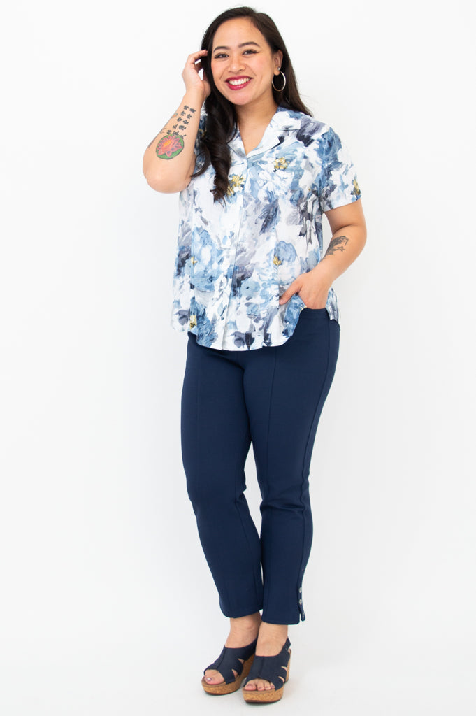 Soft, breathable Linen/Bamboo fabric in a tailored shirt style. The Samantha is great paired with capri pants or layered under a cardigan on cooler days. You can even wear it unbuttoned, for a cool shirt-jacket look.