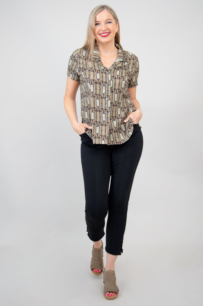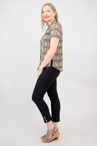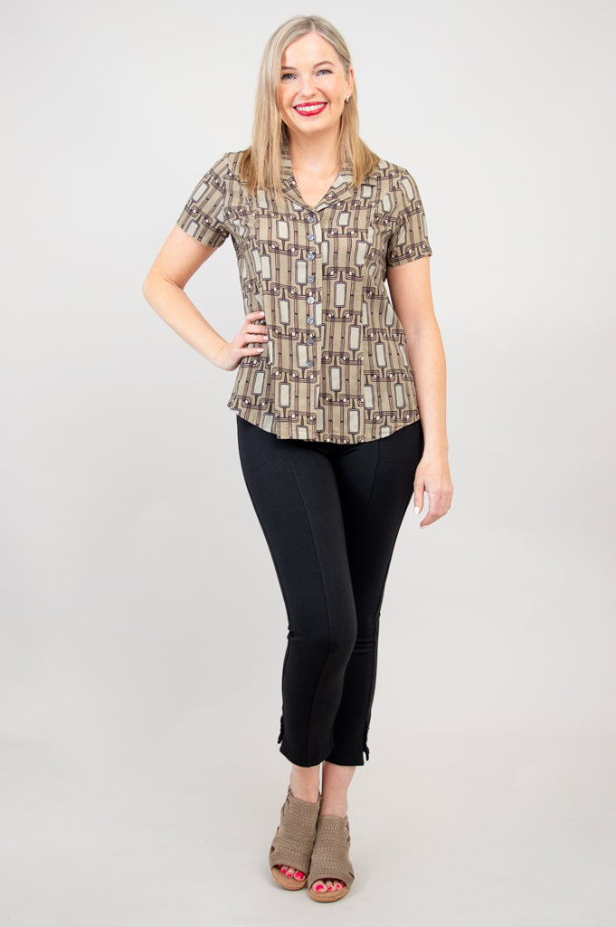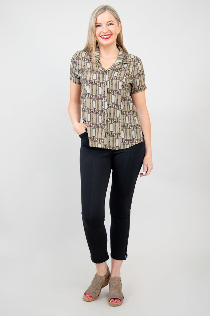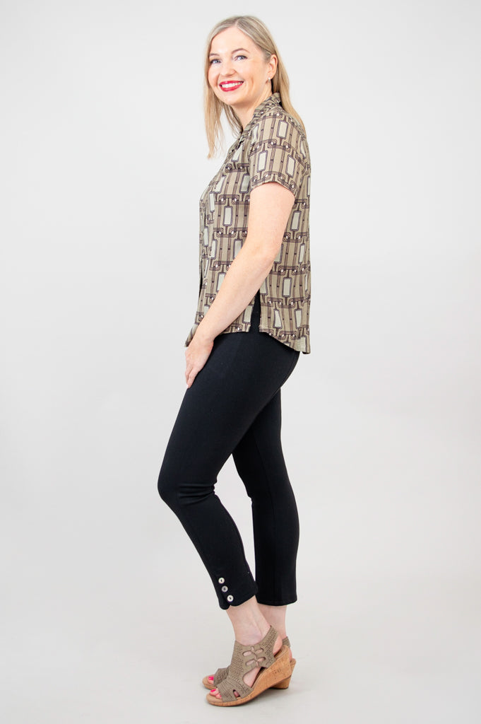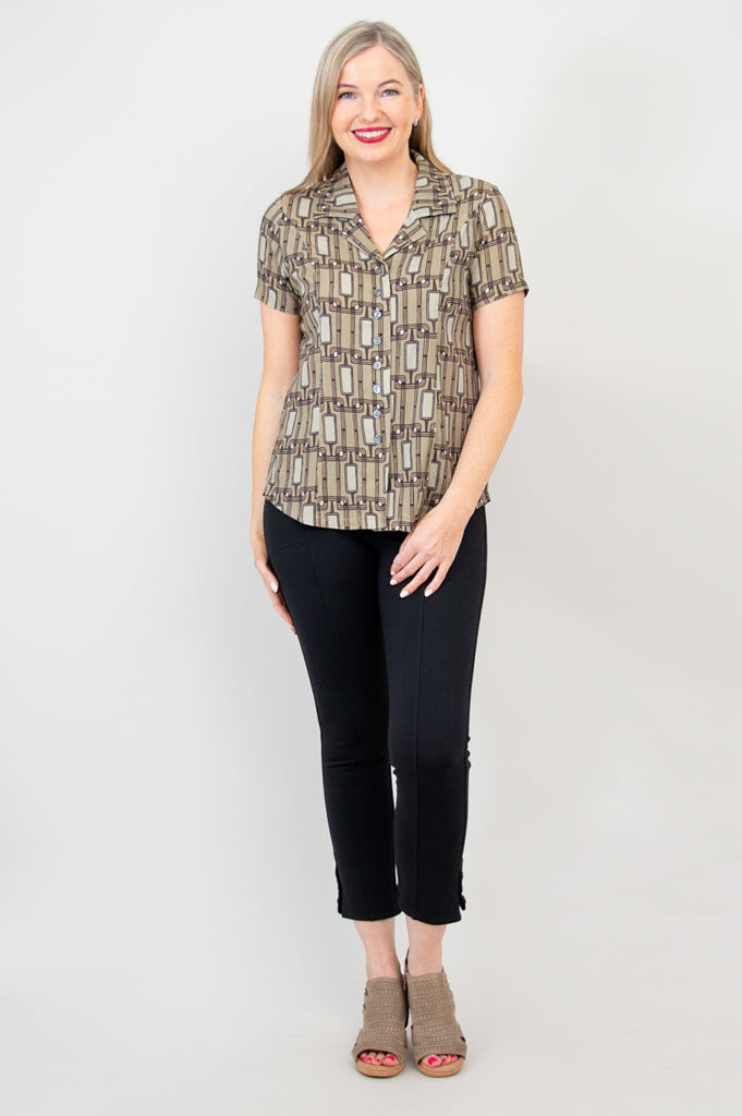 Soft, breathable Linen fabric in a tailored shirt style. A soft line on the collar opens the neckline, and buttons down the front allow for easy dressing and versatile styling. The Samantha is great paired with capri pants or layered under a cardigan on cooler days. You can even wear it unbuttoned, for a cool shirt-jacket look.