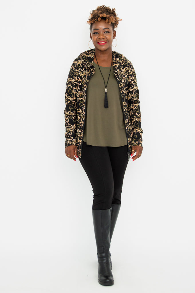 Seymour is a sleek fitted hoodie that hits at the hip. The stretch bamboo fabric allows all over stretch while providing shape. Features include a double zipper, slight cowl neck and front pockets.