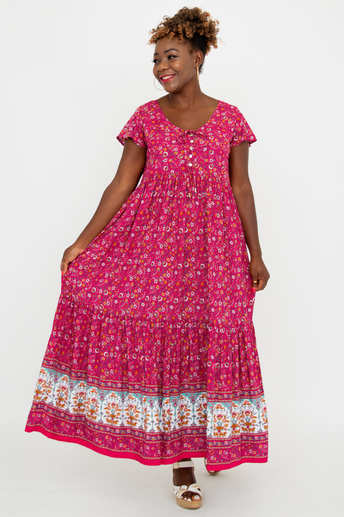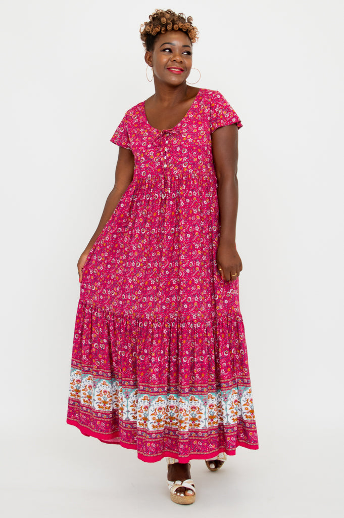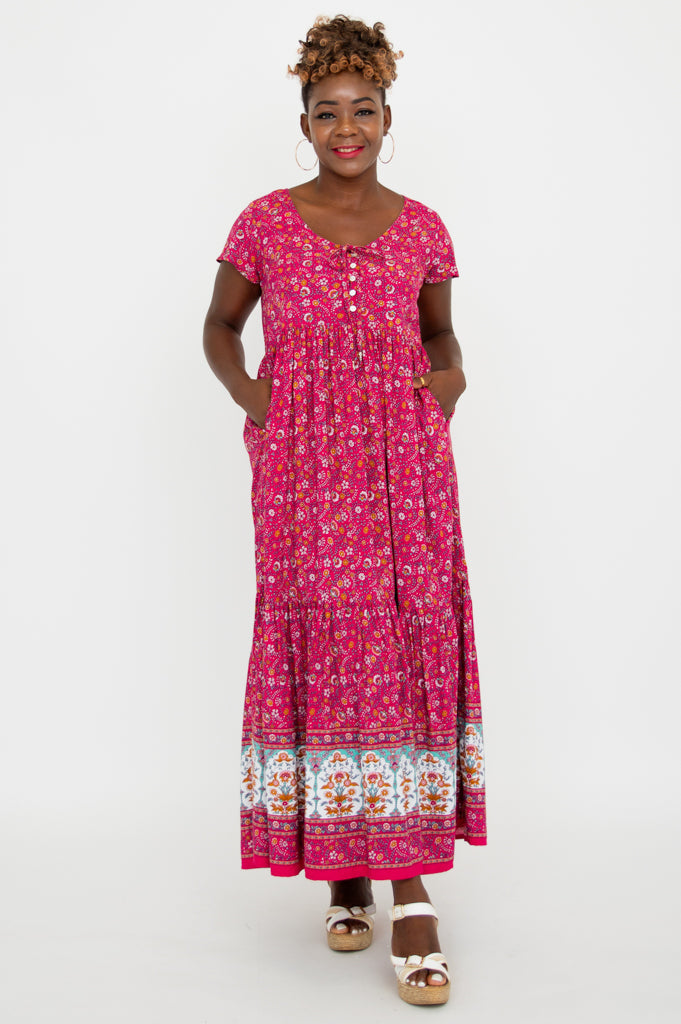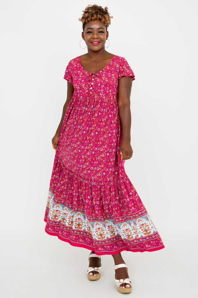 The Sharpie Dress features short flutter sleeves, tiered skirt and pockets. Small shell buttons line the front of the bodice and fabric string ties add detail.