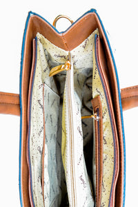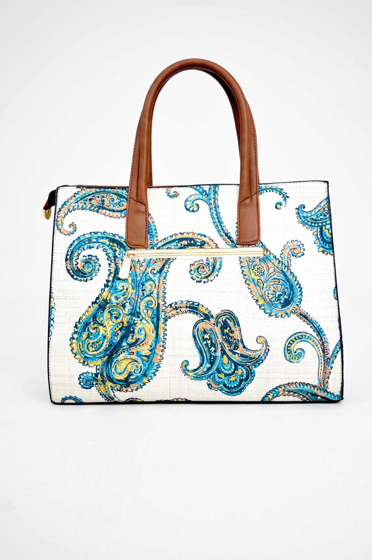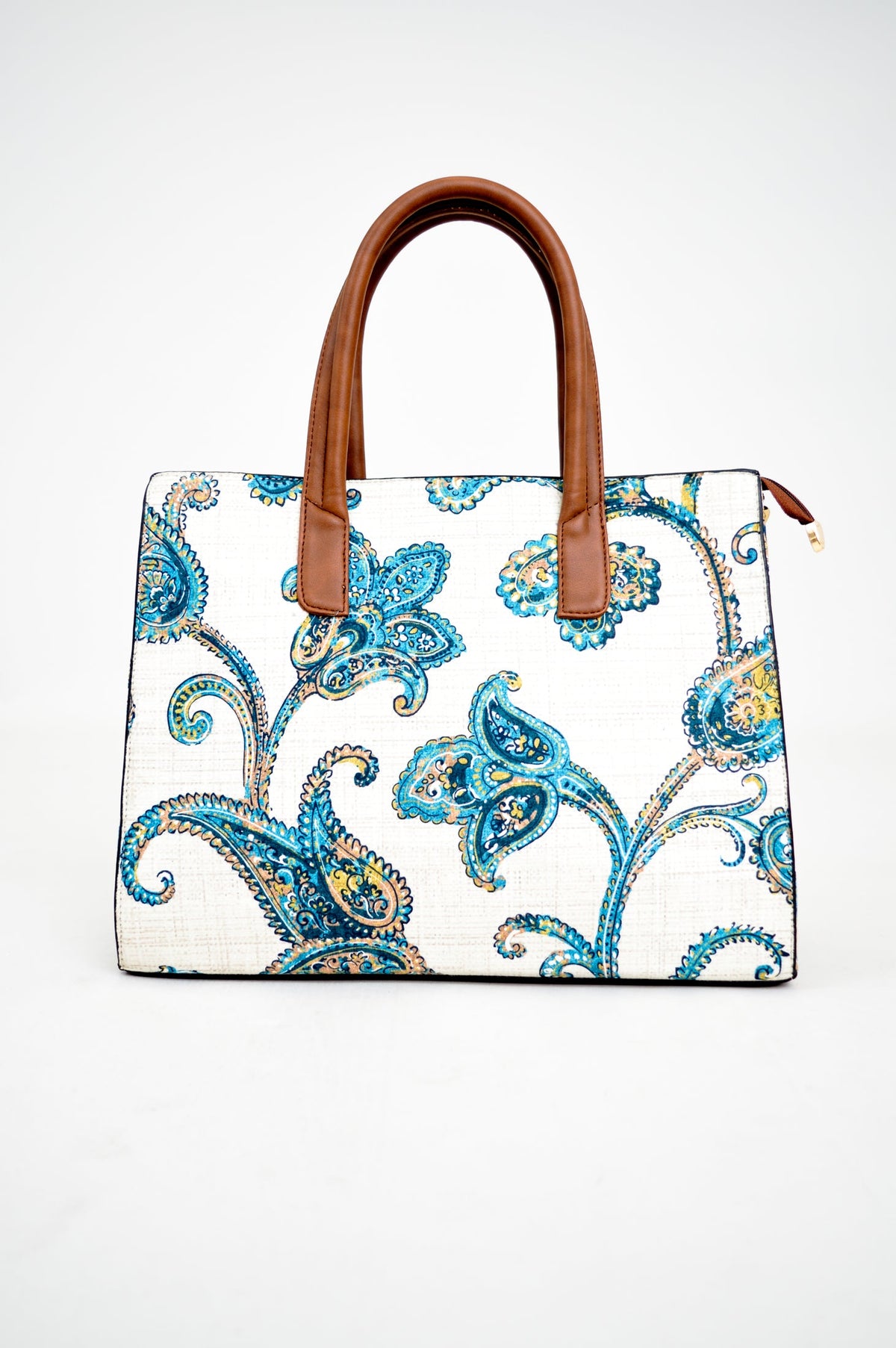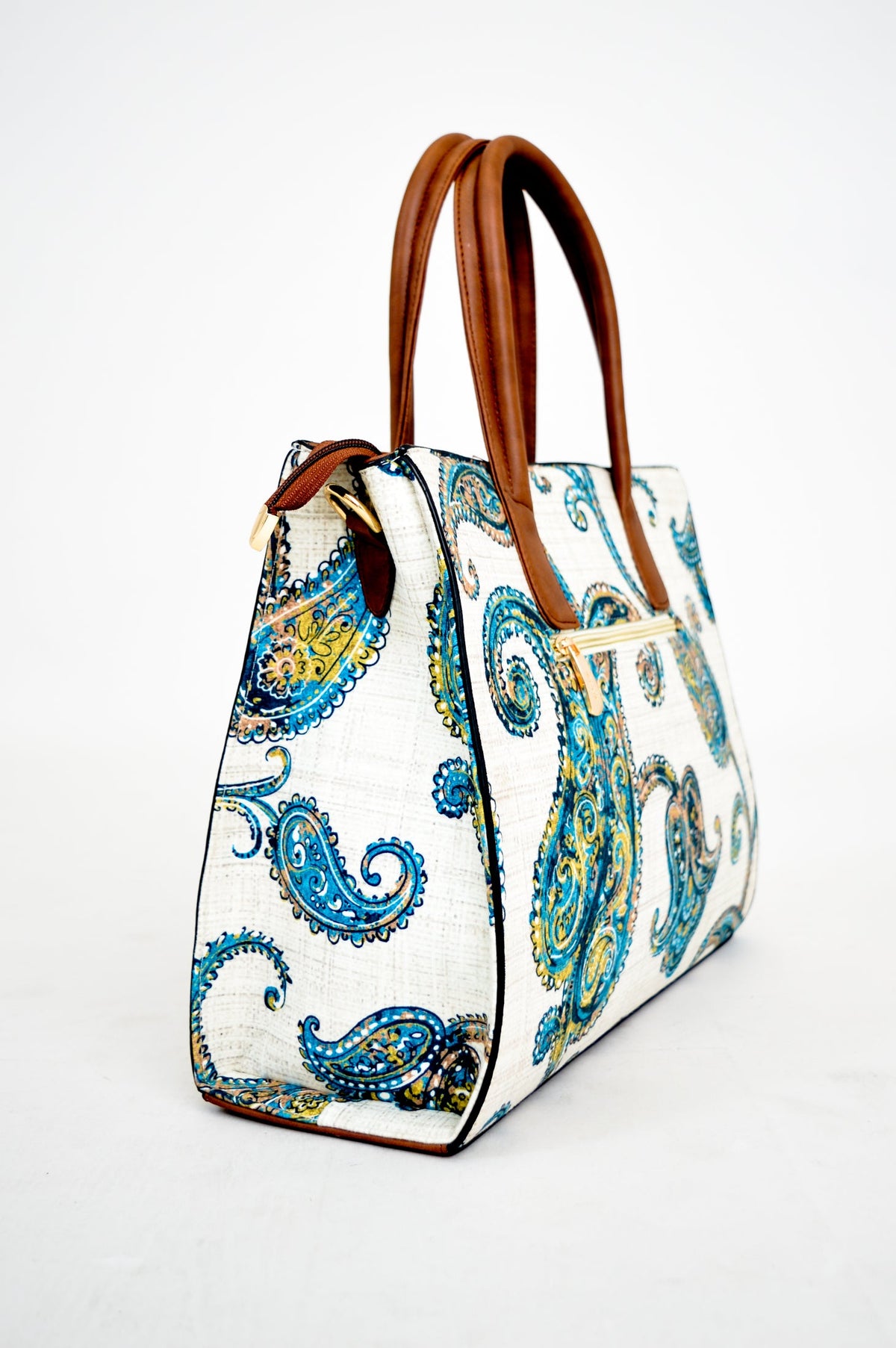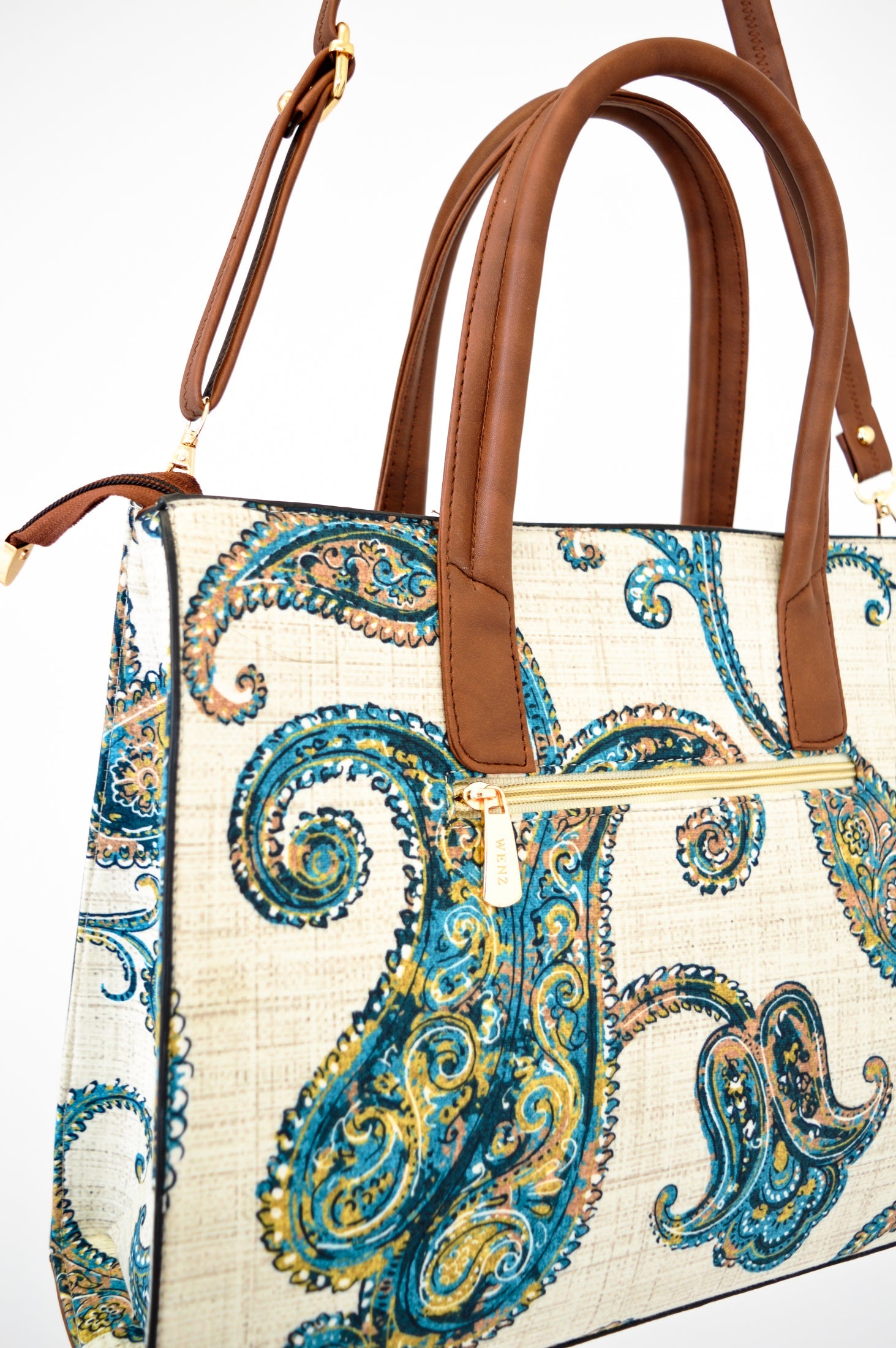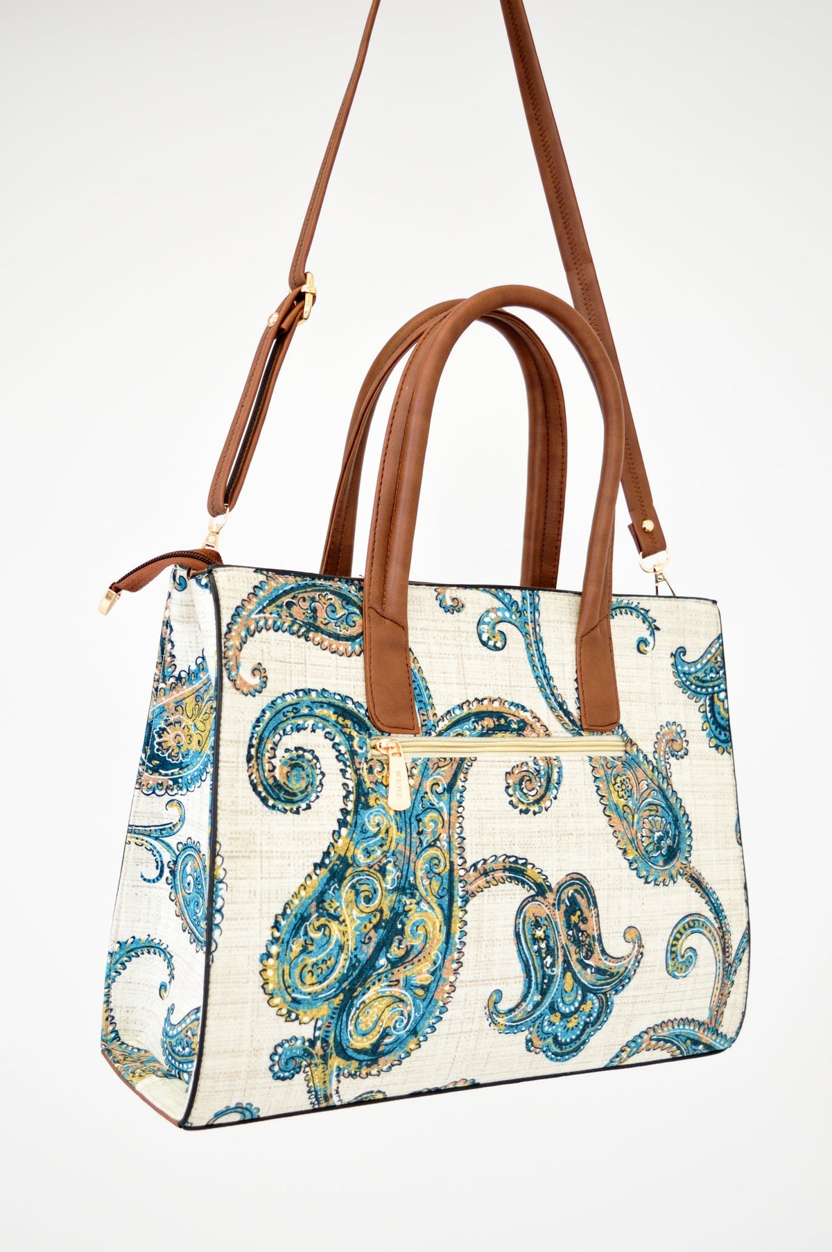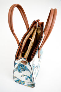 Stylish tapestry pattern bag made from cotton and natural rayon fibres with two leather handles and adjustable strap.