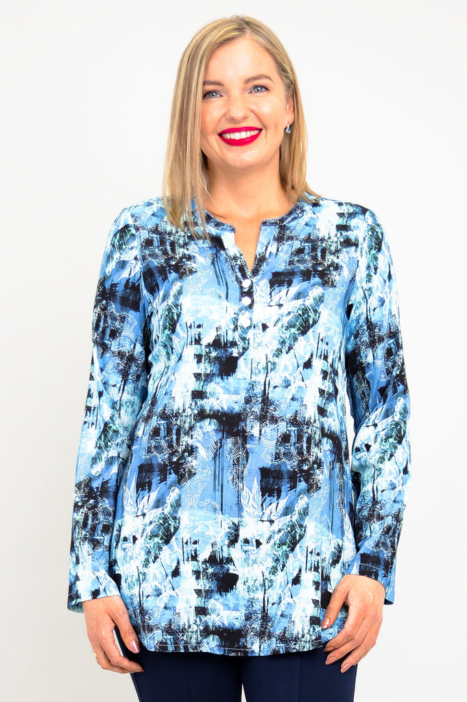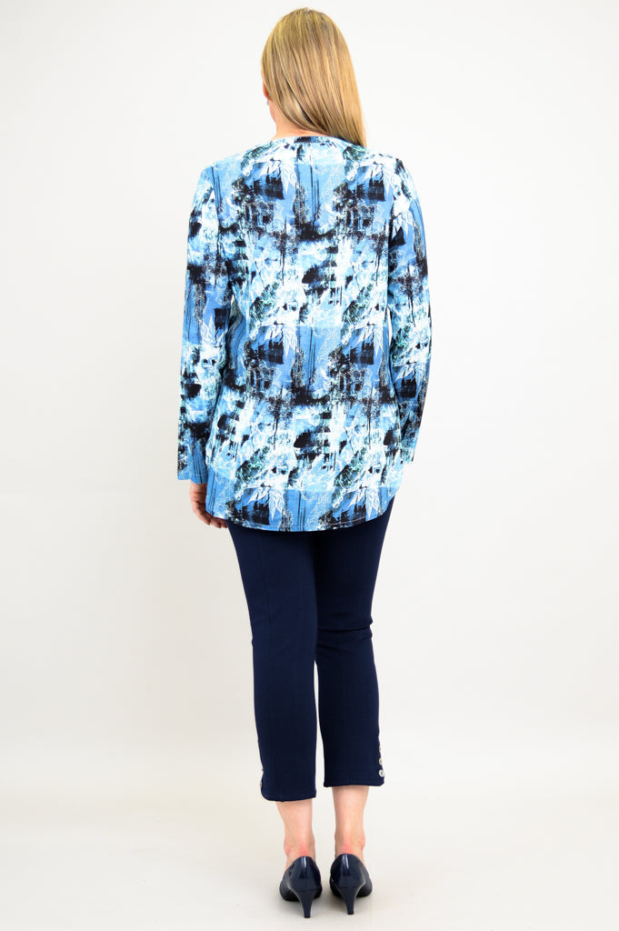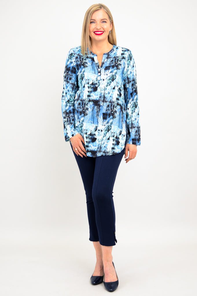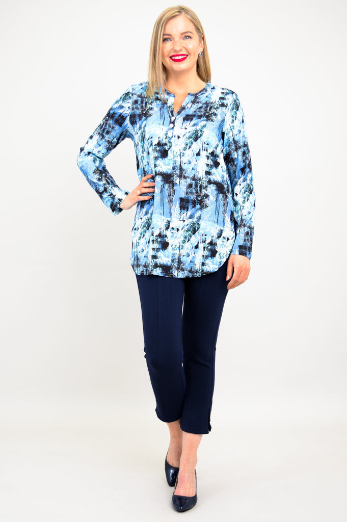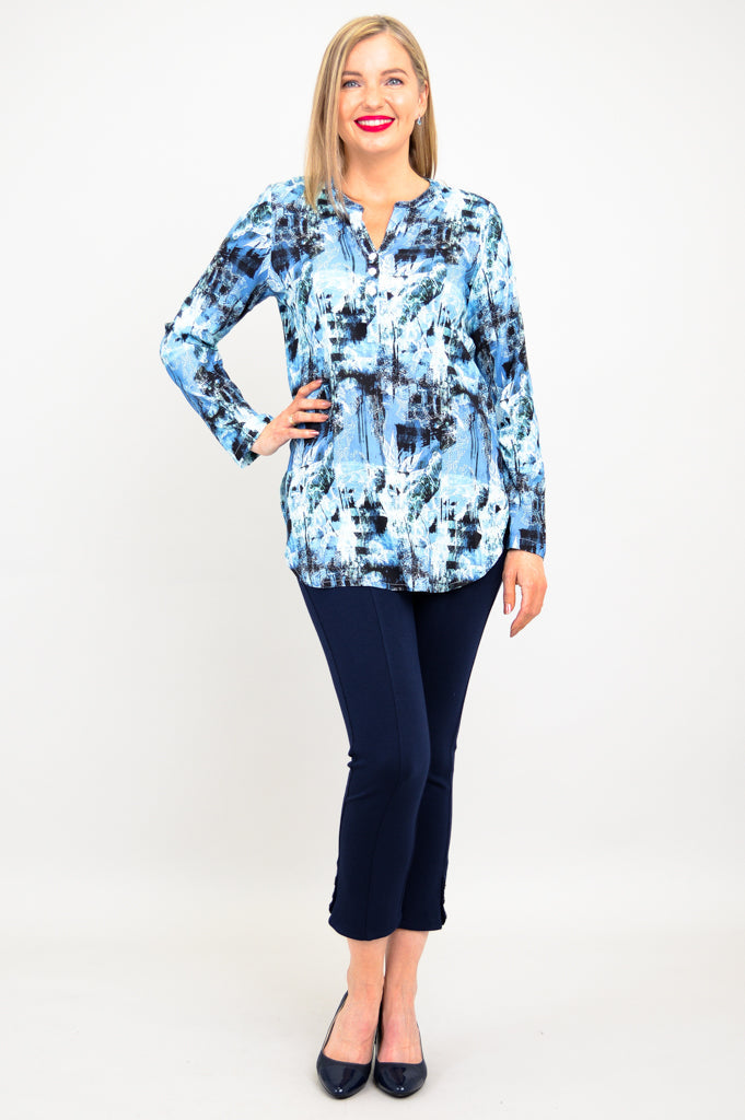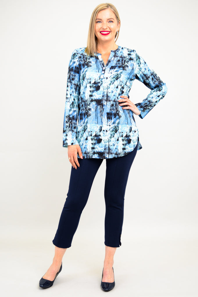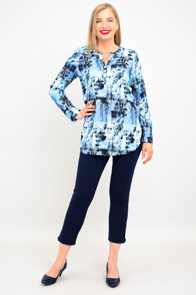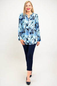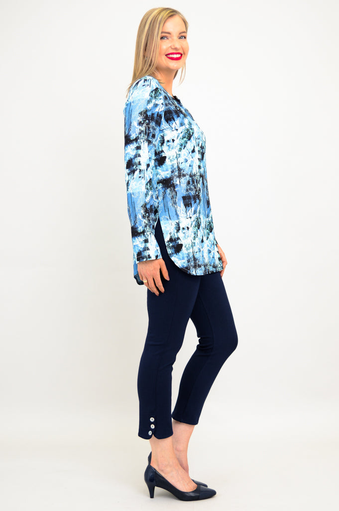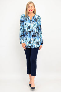 Our Tara blouse offers timelessly tailored style in cool-wear Bamboo/Linen. Traditional shirt in shoulders and placket, the Tara has a suggestion of tunic ease in length and mid-section ease. A small straight collar offers coverage, with a small V-neckline. Crisp, and easy to wear over capri pants or leggings.