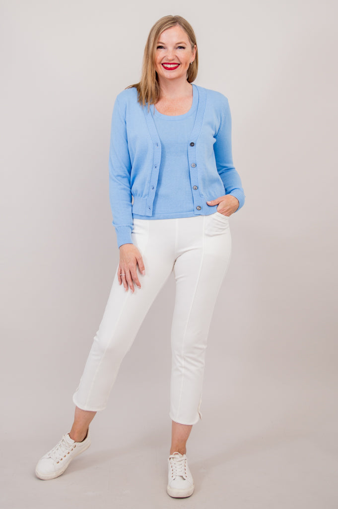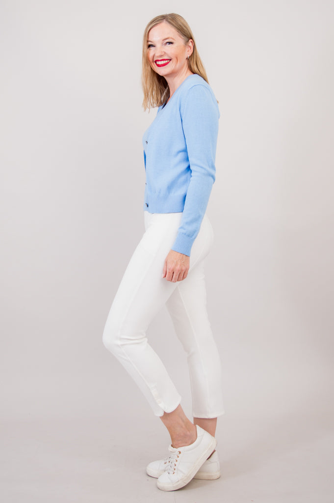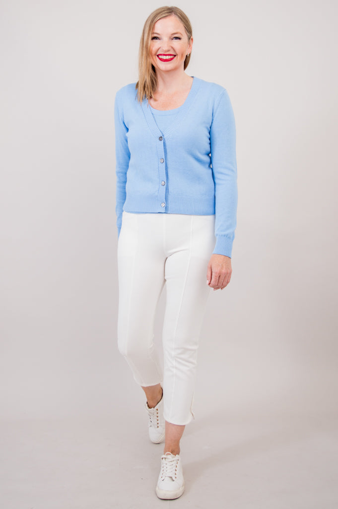Hemmed perfectly at the hips, the Tellie Cardigan is extraordinarily flattering and pairs perfectly with our Nadine Crop.