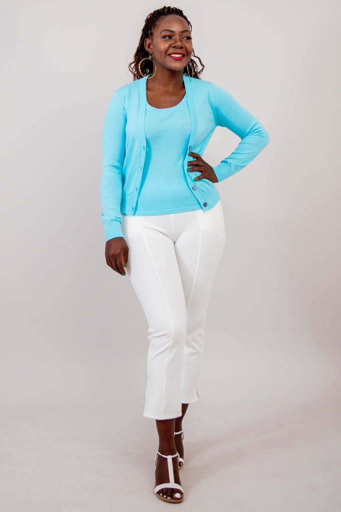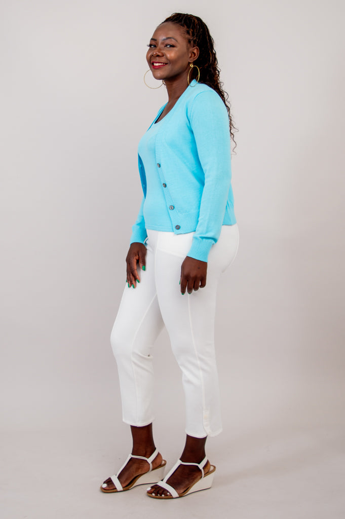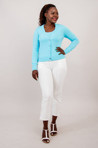 Hemmed perfectly at the hips, the Tellie Cardigan is extraordinarily flattering and pairs perfectly with our Nadine Crop.