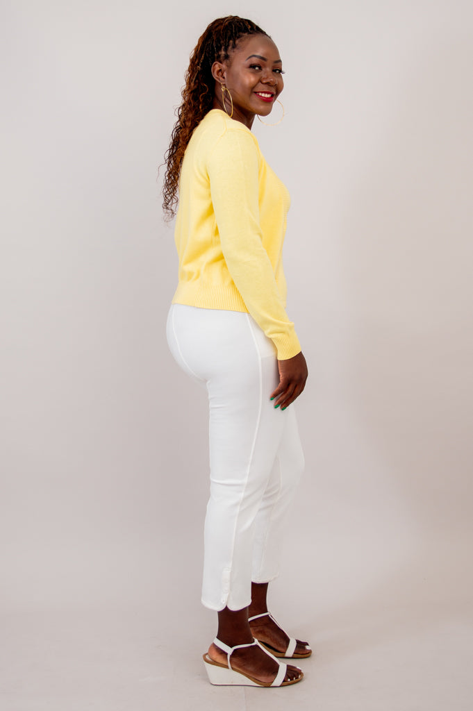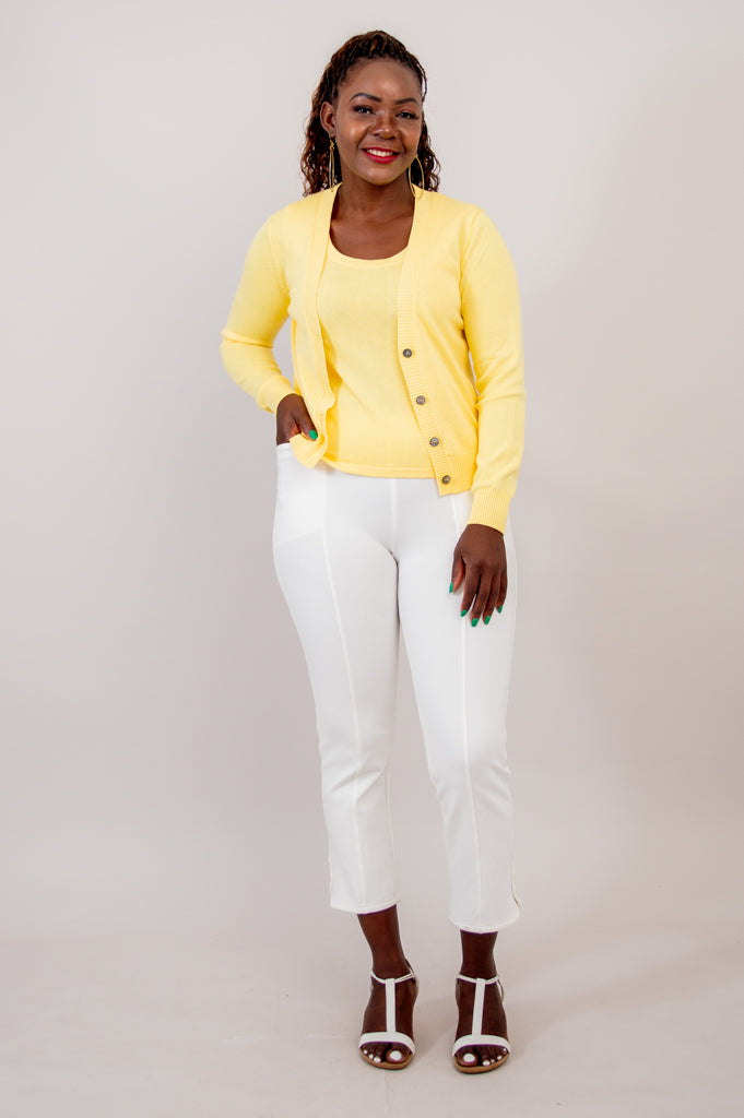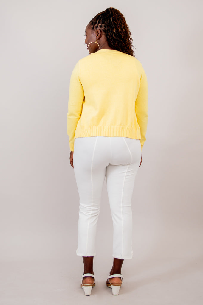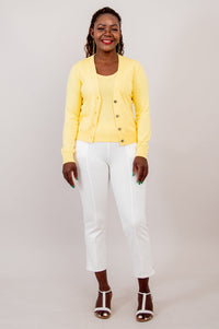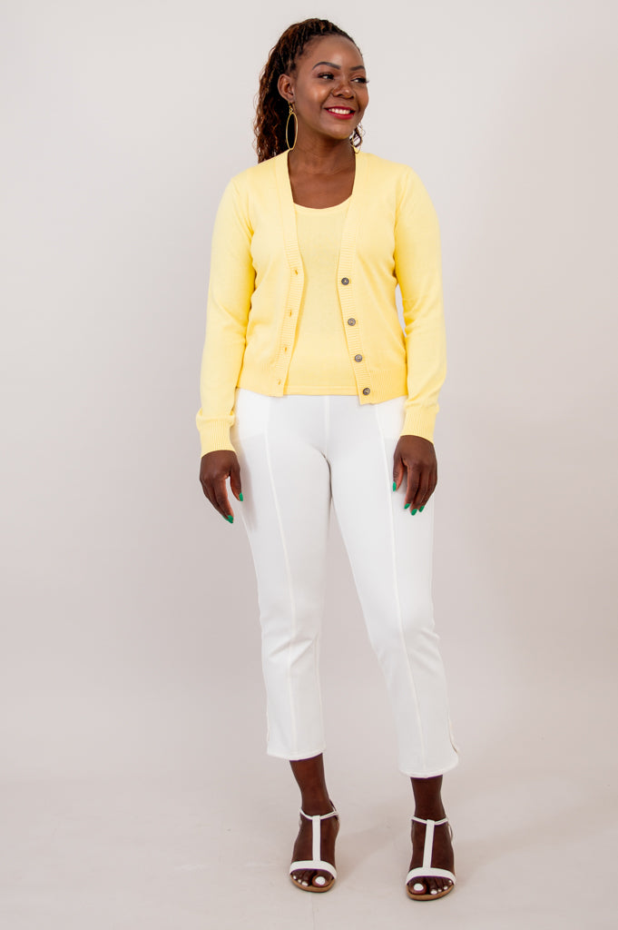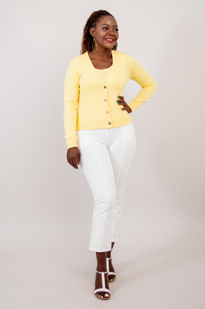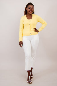 Hemmed perfectly at the hips, the Tellie Cardigan is extraordinarily flattering and pairs perfectly with our Nadine Crop.