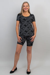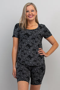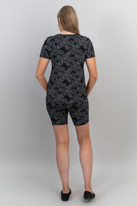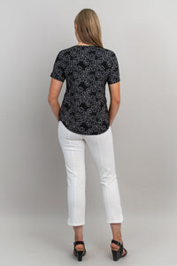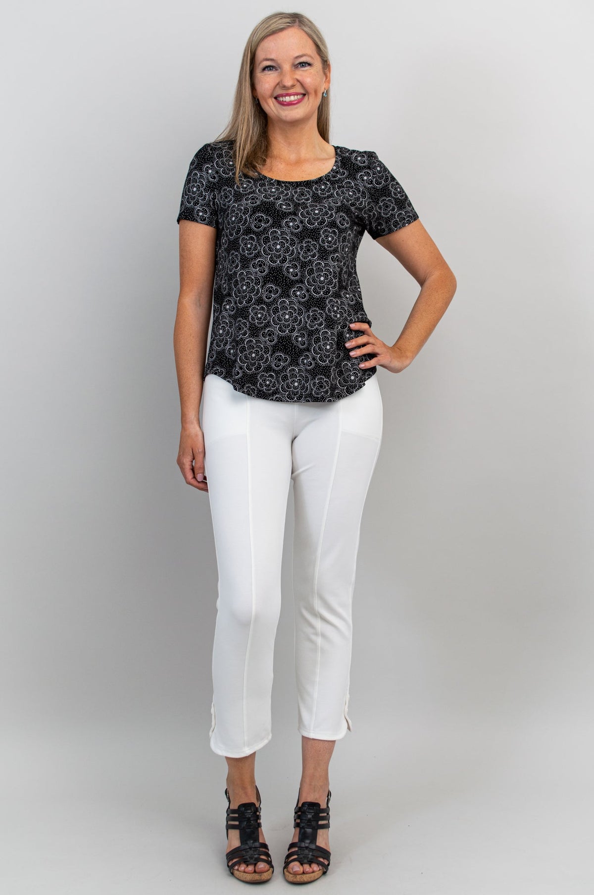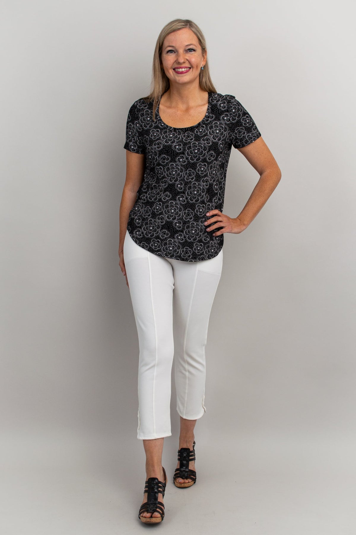 The Tessa offers easy wear with a touch of shaping, for a basic that flatters all. Fabric drapes gently, without pulling or catching around the hips and bottom. A shirt-tail hemline provides fluidity, ensuring a soft visual line. The Tessa Tee compliments trousers, capris and skirts of all cuts.